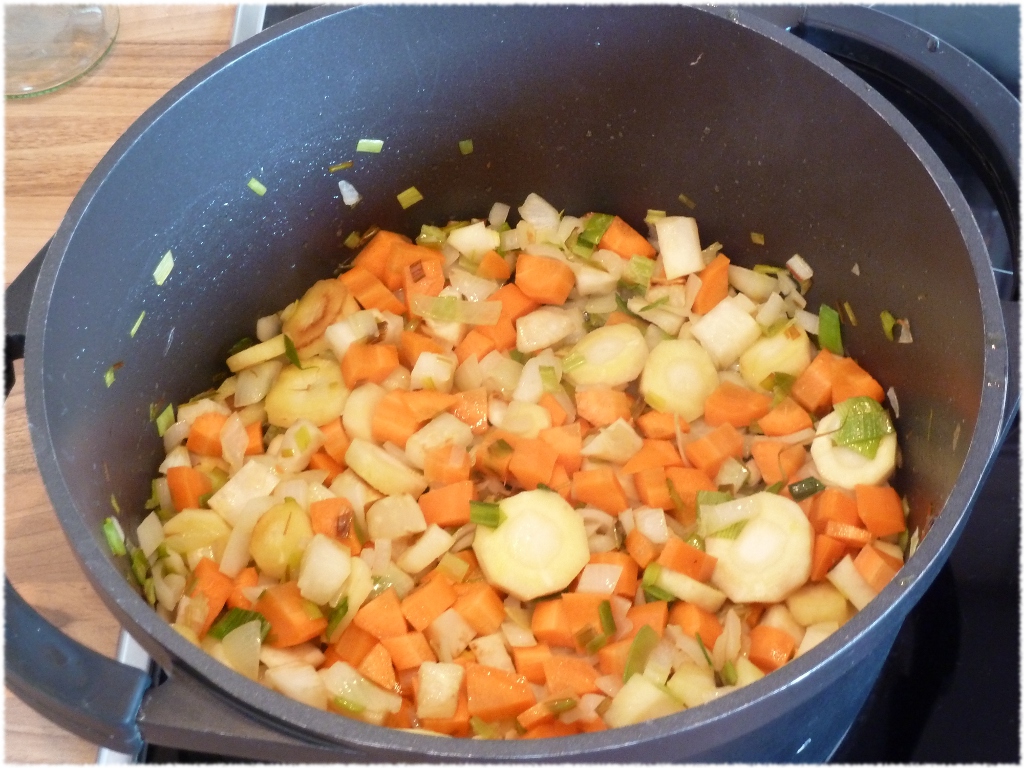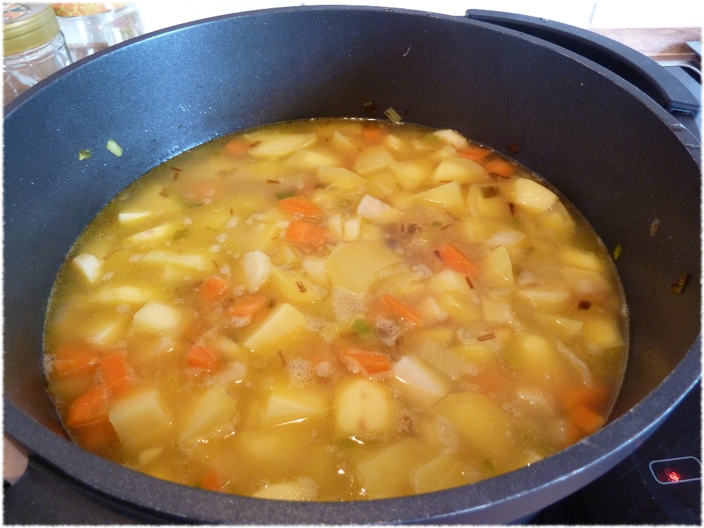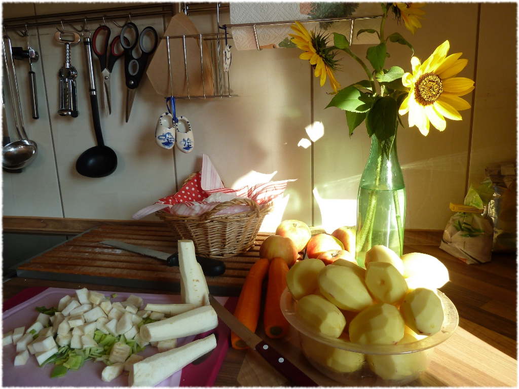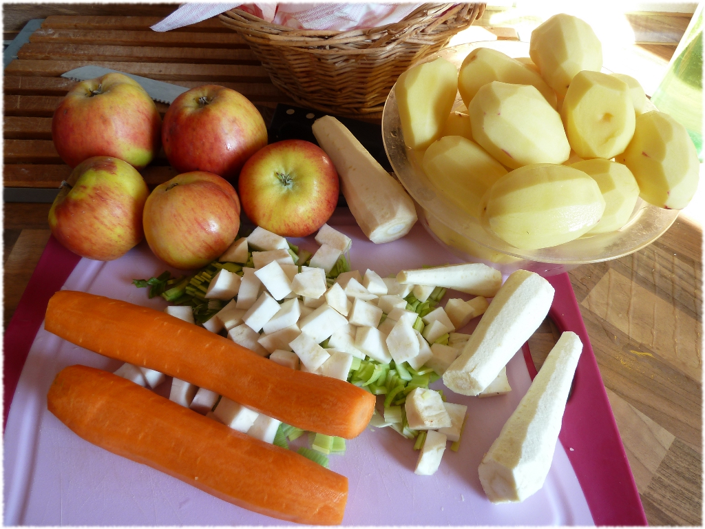 Zutaten: 1 kg Kartoffeln, 5 Äpfel, 1x Suppengrün, 2 große Zwiebeln, Pastinaken (optional), Wiener Würstchen, Lungwurst (optional), Pfeffer, Salz, Zucker