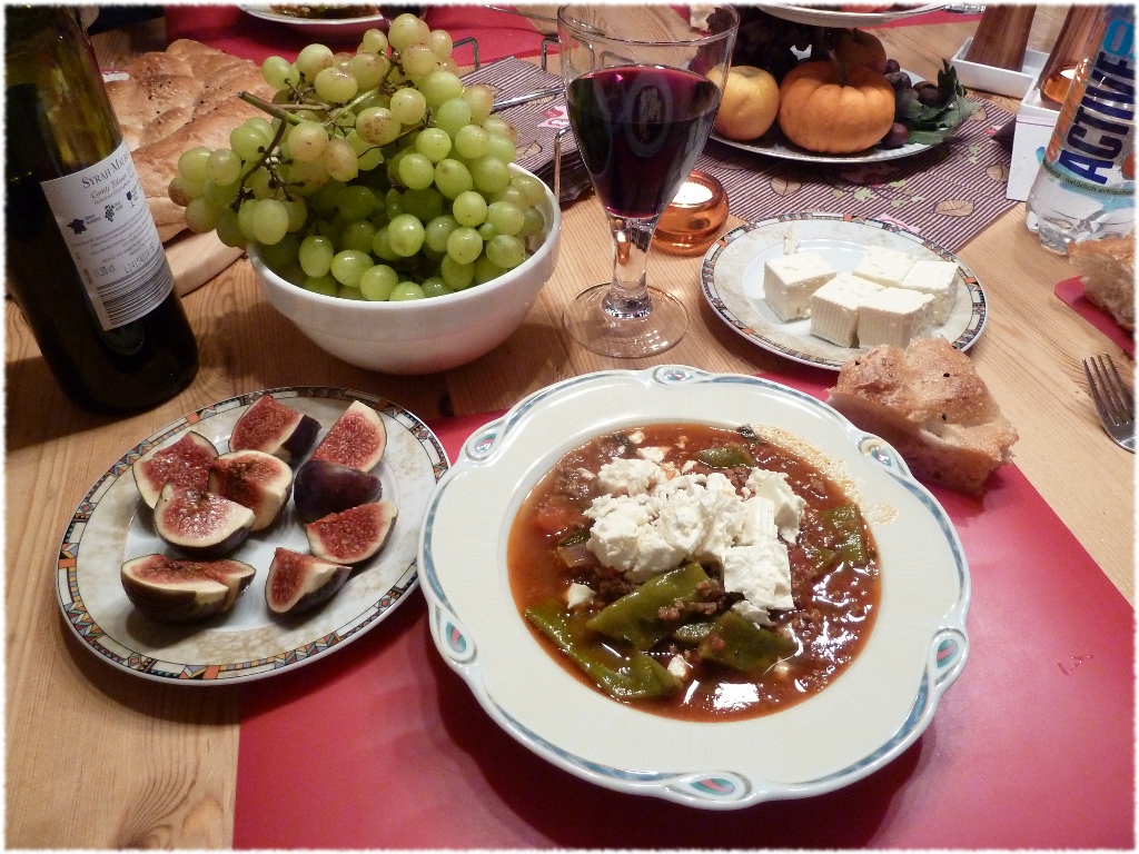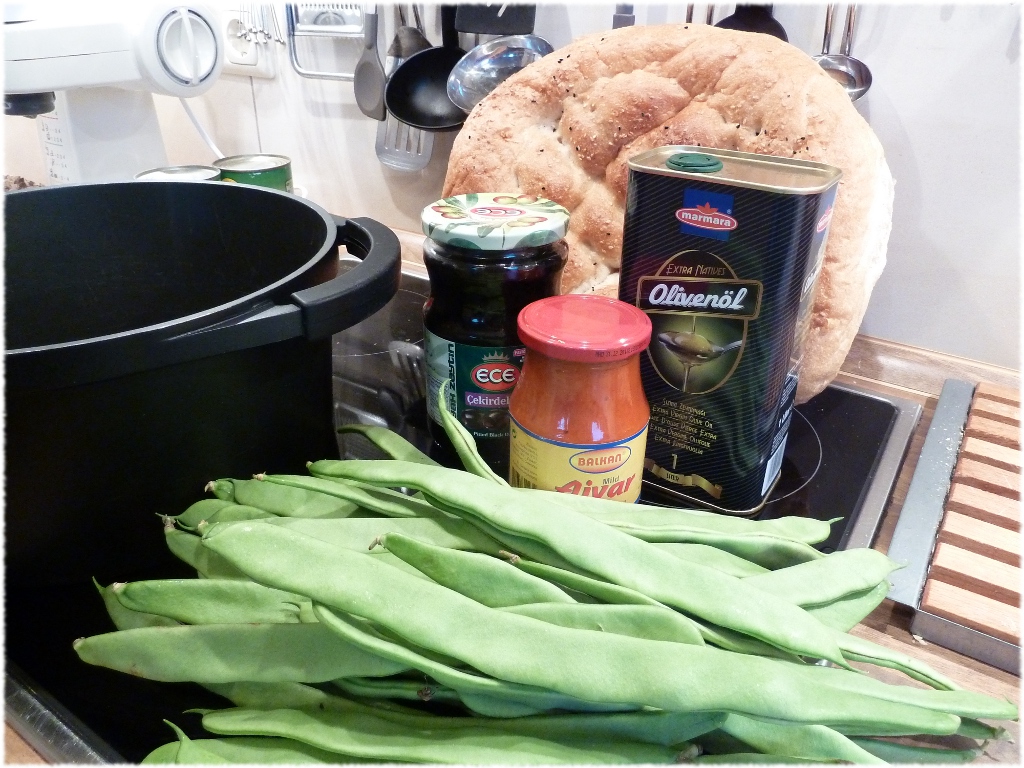 Wir lieben dieses einfache Gericht, besonders im Herbst. Hackfleisch in Olivenöl anbraten, Zwiebeln dazu geben und anbraten, Bohnen schnippeln, auch ein wenig anbraten, Tomaten dazu und köcheln lassen. Mit Salz, Pfeffer, Paprika abschmecken, Lorbeerblatt dazu geben. Schön viel Petersilie in den Eintopf geben. Mit Schafskäse und türkischem Fladenbrot genießen. Ein Rotwein ist köstlich dazu.
