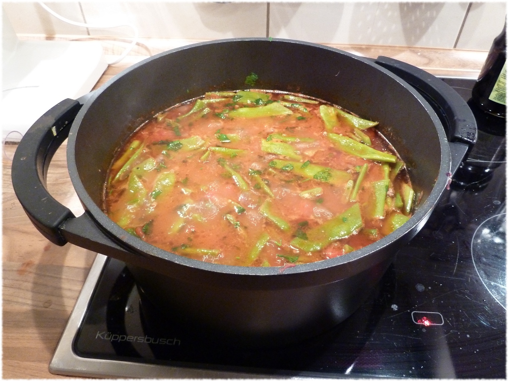 Zutaten: 1 kg Lamm-Rindfleisch-Hack, 1 kg Stangenbohnen, 2 kleine Dosen geschälte Tomaten, 2-3 Zwiebeln, Pfeffer, Salz, Paprika rosenscharf, Lorbeerblatt, Olivenöl, Petersilie