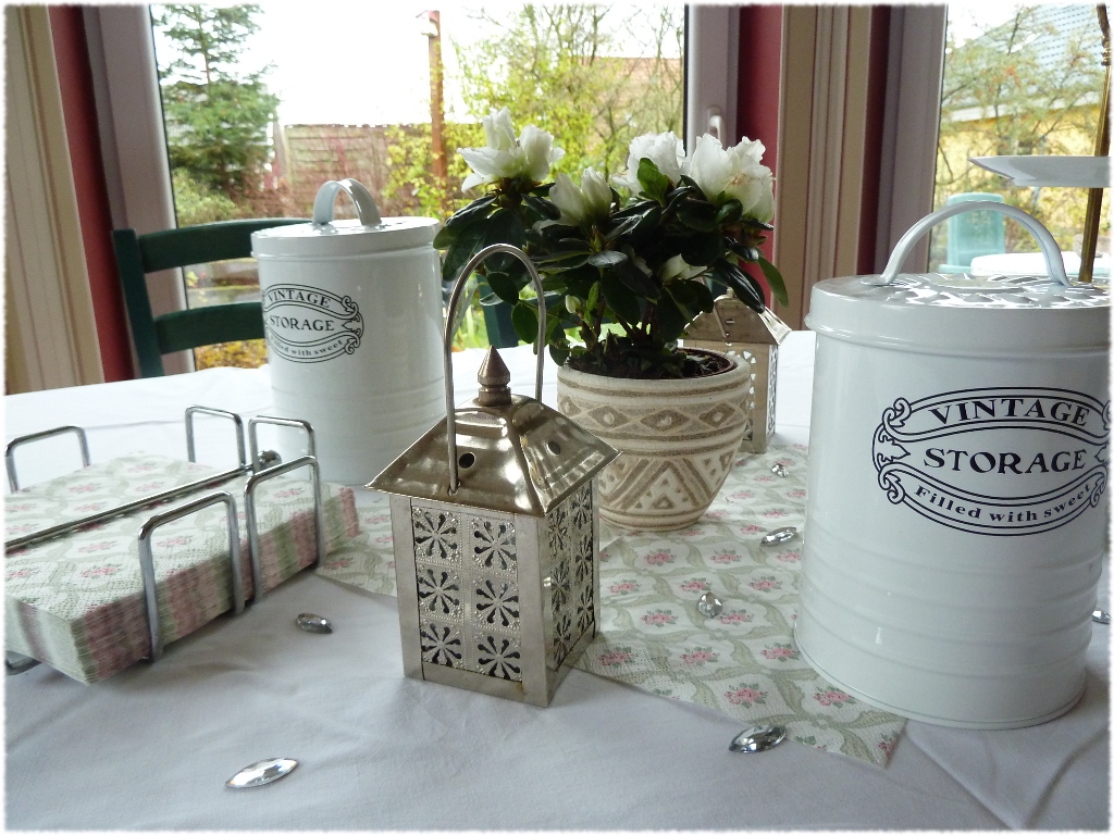 Diese Wochenende war Girli-Geburtstag und drei Teenager kamen zum Kaffee. Manchmal geht Tischdeko bei mir auch ohne großen Bastelaufwand. Ich fand weiß, silber und ein bisschen Vintage passte zum Anlass. Da die Mädels auch ein bisschen Scrapbooking machen wollten, hatte ich auch ein paar kleine silbernen Bling-Bling Steinchen gekauft und vor dem eigentlichen Verwendungszweck als Deko missbraucht.