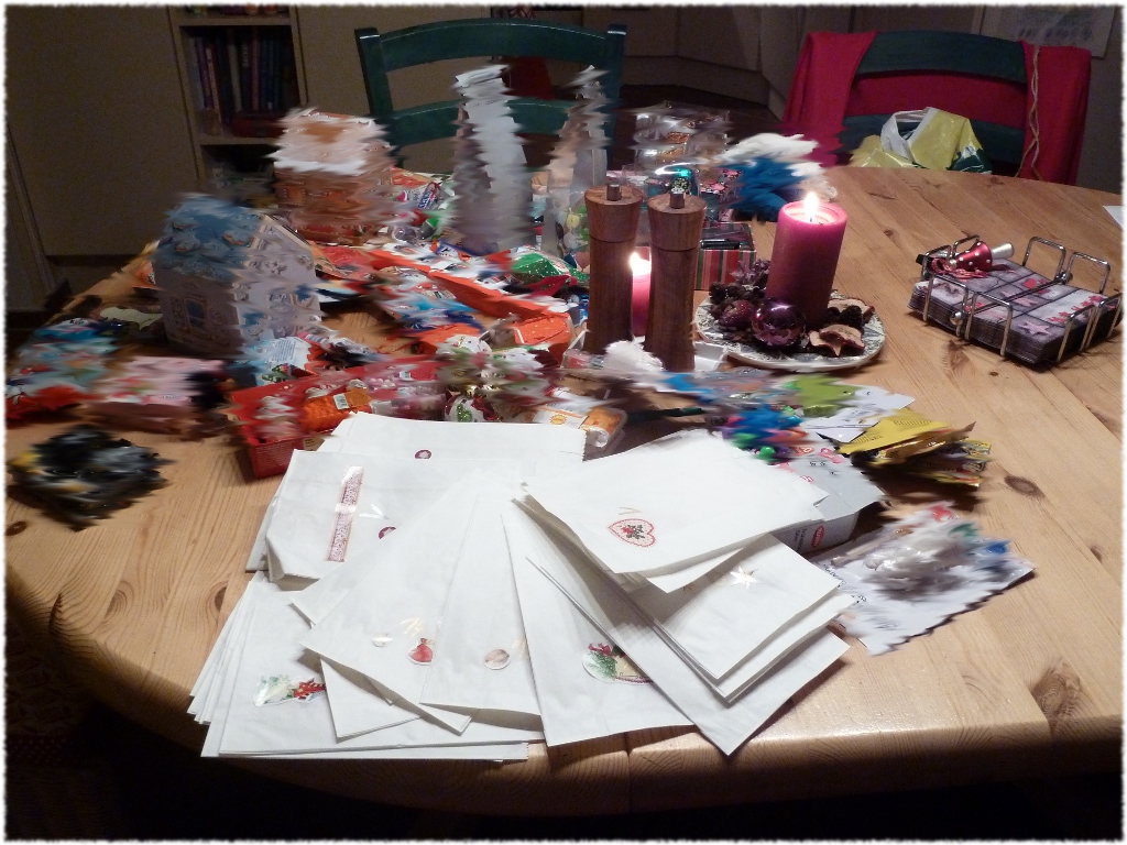 Als ich die beiden Wutze gefragt habe, ob sie einen gekauften oder den selbstgebastelten Weihnachtskalender haben möchten, war die Antwort sehr eindeutig. Also hieß es, wieder 48 Tütchen packen und undiversell eine Mädchen- und eine Jungsvariante packen. Anbei ein kleiner Eindruck vom Werkeln. Keine Angst, Ihr habt nicht zu viel Glühwein getrunken und seht verschwommen. Aus Sicherheitsgründen (das Schneckchen schaut auch gerne im Blog vorbei) habe ich den Inhalt der Tütchen verwischt.