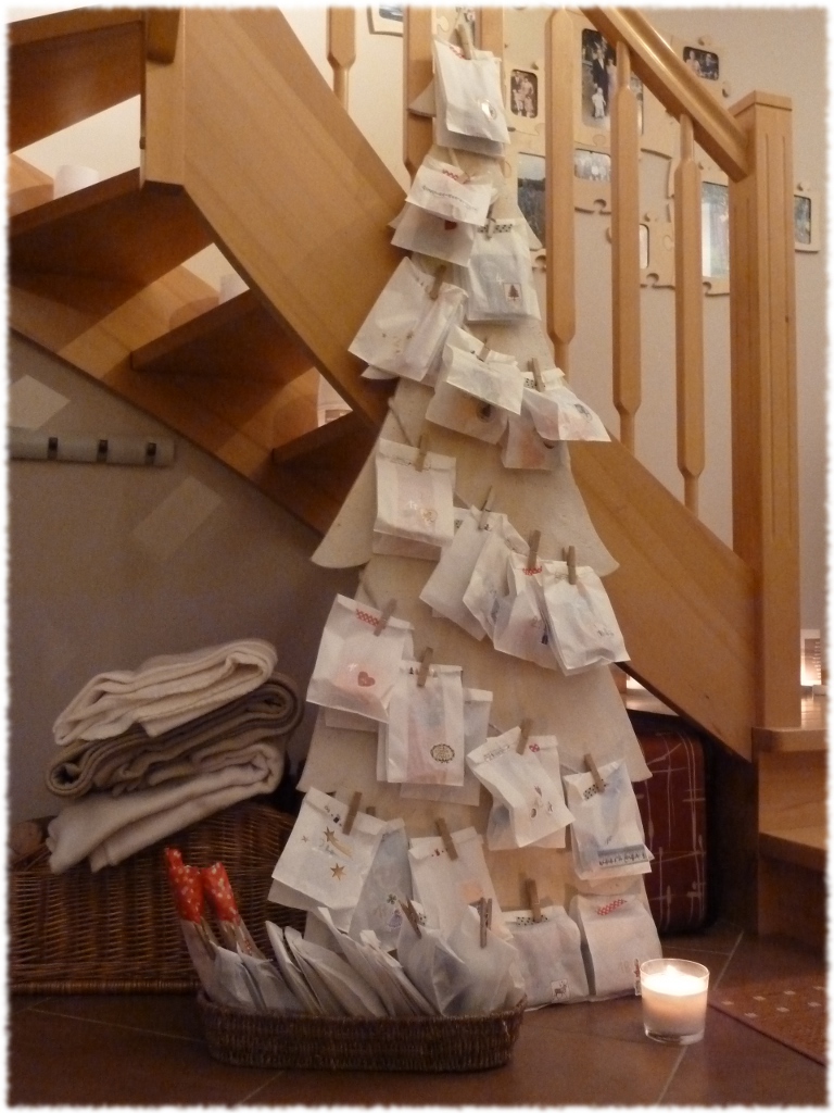 Der Weihnachtsbaum besteht aus einer OSB-Platte, das ich übrigens jeden Tag in die weite Welt verkaufe :-). Nach dem Ausschneiden mit meiner Stichsäge habe ich sie weiß/natur angemalt. Mit einer hellen Filzschnur umwickelt, können jetzt die Tütchen mit Holzklammern an dieser befestigt werden. Da es doch ein paar zu viele Tütchen für den Baum sind, habe ich den Rest in einen Weidenkorb gelegt. Man, was waren die Kinder schon aufgeregt!