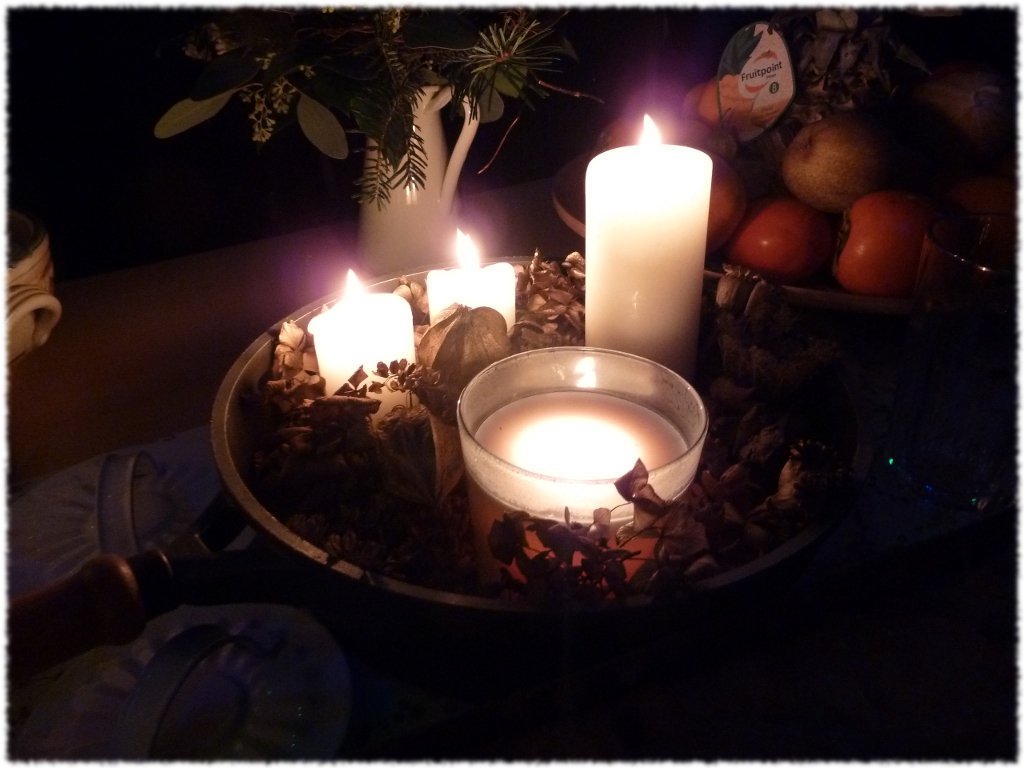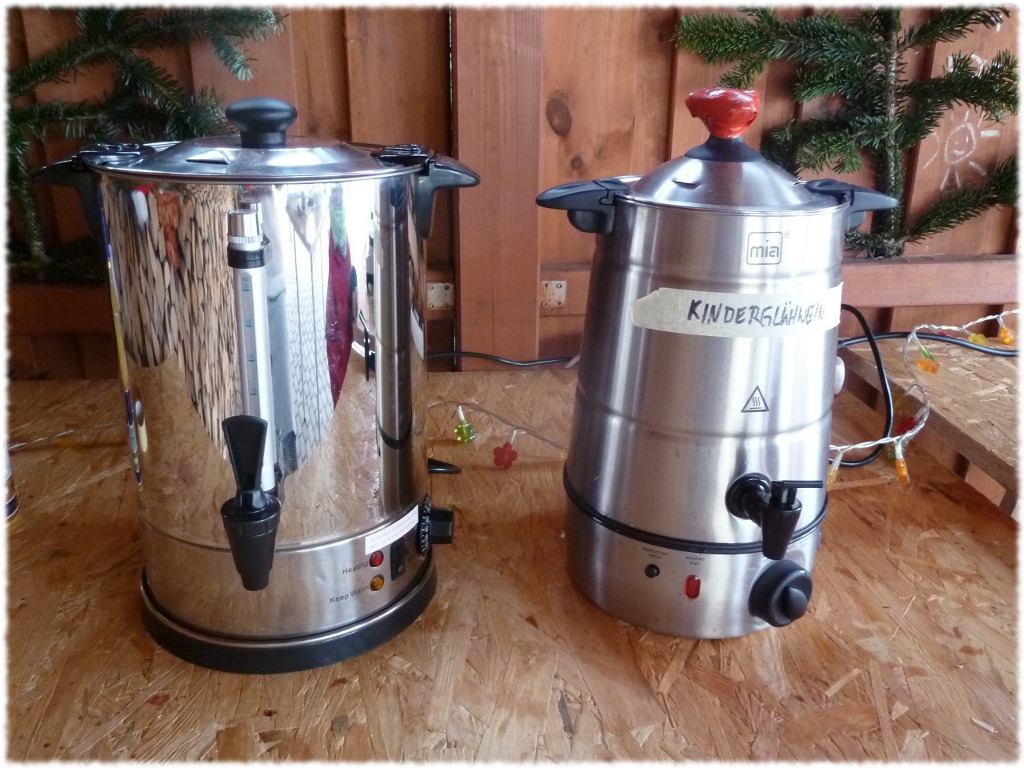 Unsere jährliche Glühweinparty findet jedes Jahr am ersten Adventswochenende statt. Da schmeckt der Glühwein noch gut, wenn man bis dahin überhaupt schon einen getrunken hat. Zwei Glühweinbereiter sind sehr hilfreich, der eine ist von lieben Nachbarn geborgt, und wird für Kinderglühwein genutzt. Weiße Mädchenschlittschuhe und der Kronleuchter werden aufgehängt. Ein bisschen Tannengrün und Deko, die sich im Laufe der Jahre immer mehr erweitert hat, sorgen für eine gemütliche Atmosphäre.