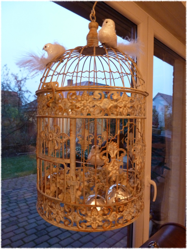 „Nein fünf!“ müsste ich antworten :-). Die haben sich nämlich in meiner Weihnachtsdeko versteckt. Auf einem Kunstmarkt habe ich vor Jahren den Vogelkäfig erstanden und mag ihn wie am ersten Tag. Dieses Jahr gesellen sich zu dem schwarzen Vögelchen ein paar gefiederte Freunde, die ich einfach mitnehmen musste, obwohl ich keine Weihnachtsdeko kaufen wollte. Na ja, wer kennt das nicht, dass die Vorsätze, kaum ausgesprochen, über den Haufen geworfen werden. Mit ein paar hellen Hortensienblüten und silbernen Weihnachtskugeln war die Deko jedenfalls schnell fertig.