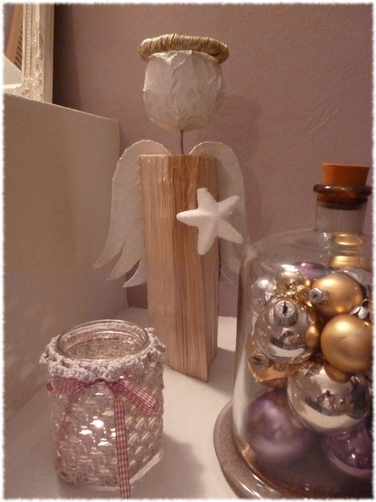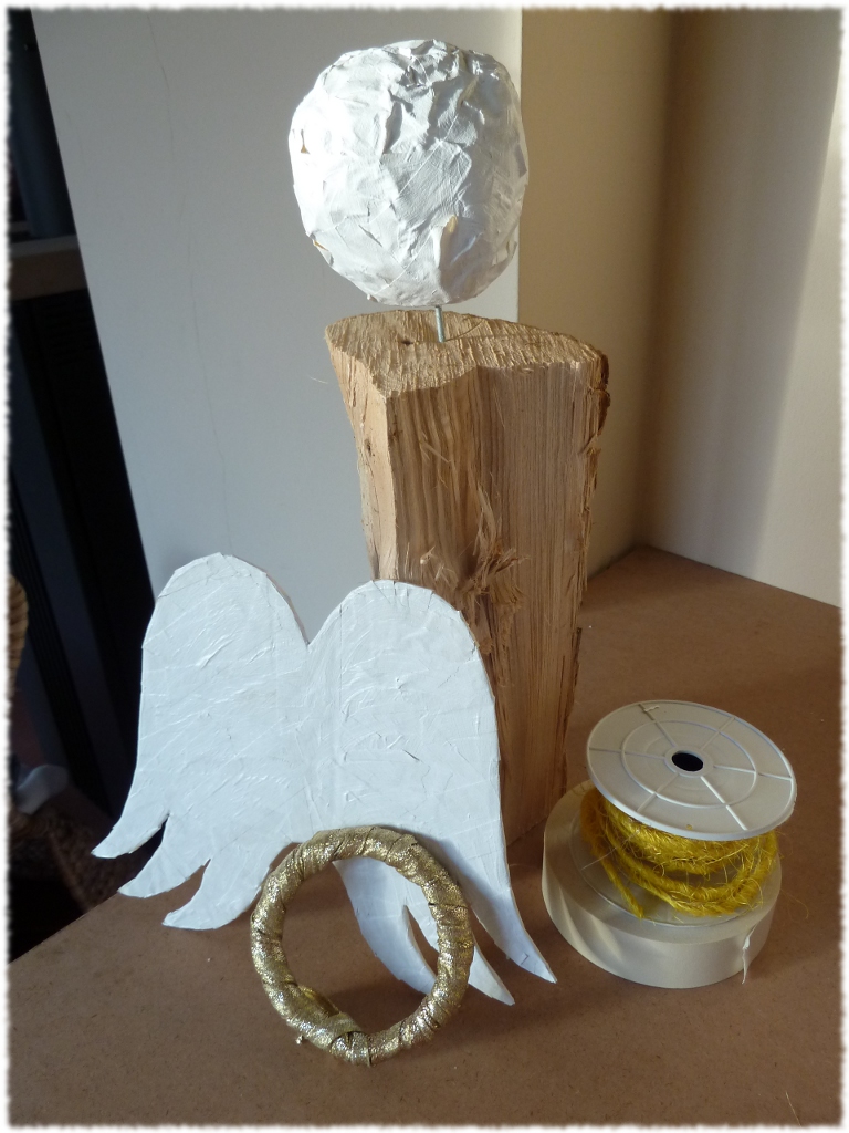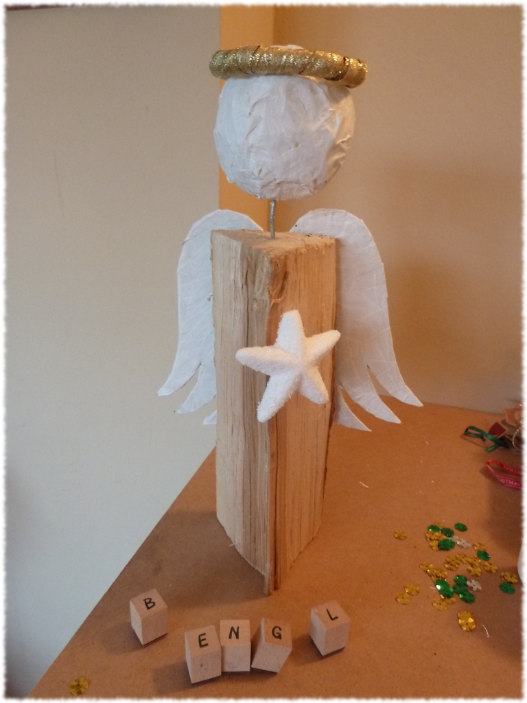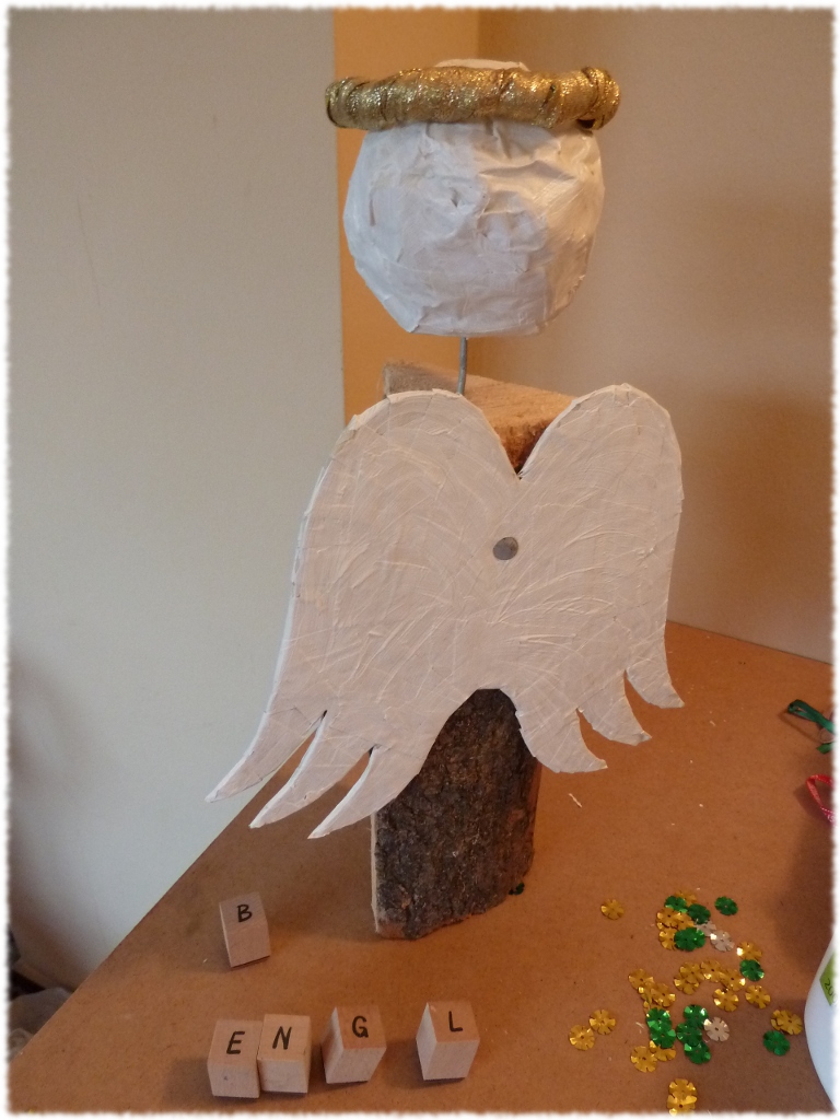 Endlich habe ich es auch geschafft, mir den berühmten Holzscheitengel aus der Landlust zu basteln. Mich hat immer dieses Gegatsche mit Gips abgeschreckt. Die Bastelaktion mit der Trollmaske hat mich auf die Idee gebracht, statt Gips mit Malerkrepp zu arbeiten. So habe ich zu einem Ball zerknülltes Papier mit Alufolie umwickelt und das Ganze mit Malerkrepp beklebt. Den Engelsflügel habe ich aus Pappe ausgeschnitten und ebenso mit Malerkrepp beklebt. Dabei sind alle Kanten umwickelt, das gibt den Flügeln zusätzliche Stabilität. Danach ein bisschen weiße Acrylfarbe und Kopf sowie Flügel waren schnell bemalt. Mit einem Nagel im Kopf und im Rücken war die Endmontage fast beendet. Den Kopf habe ich auf den vorher abgeknipsten Nagel gesteckt und mit Heißkleber befestigt. Aus meinem Fundus habe ich ein dickeres Sisalband mit innenliegendem Draht mit Goldband umwickelt und der Heiligenschein war fertig.