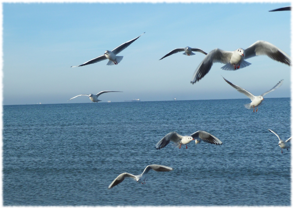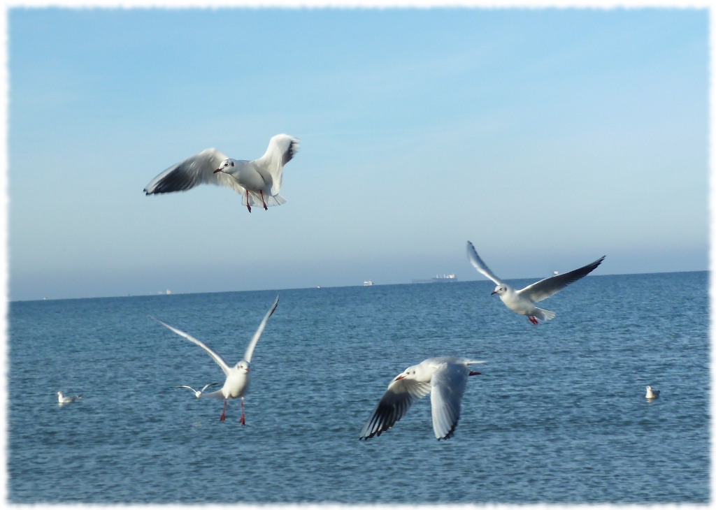 Nach Tagen voller Regen, Sturm und zugegeben gutem Essen tat es gut, dass das Wetter sich änderte und uns mit blauem Himmel belohnte. Also mal wieder an die geliebte Ostsee nach Warnemünde, das ich im Winter lieber mag als im Sommer. Nichts ist herrlicher als sich durchpusten zu lassen und danach in die wohlige Wärme zurückzukehren. Was stört uns da das Geschrei der Möwen. Die ließen sich durch ein paar hochgeschmissene Steine gut aufs Foto bahnen.