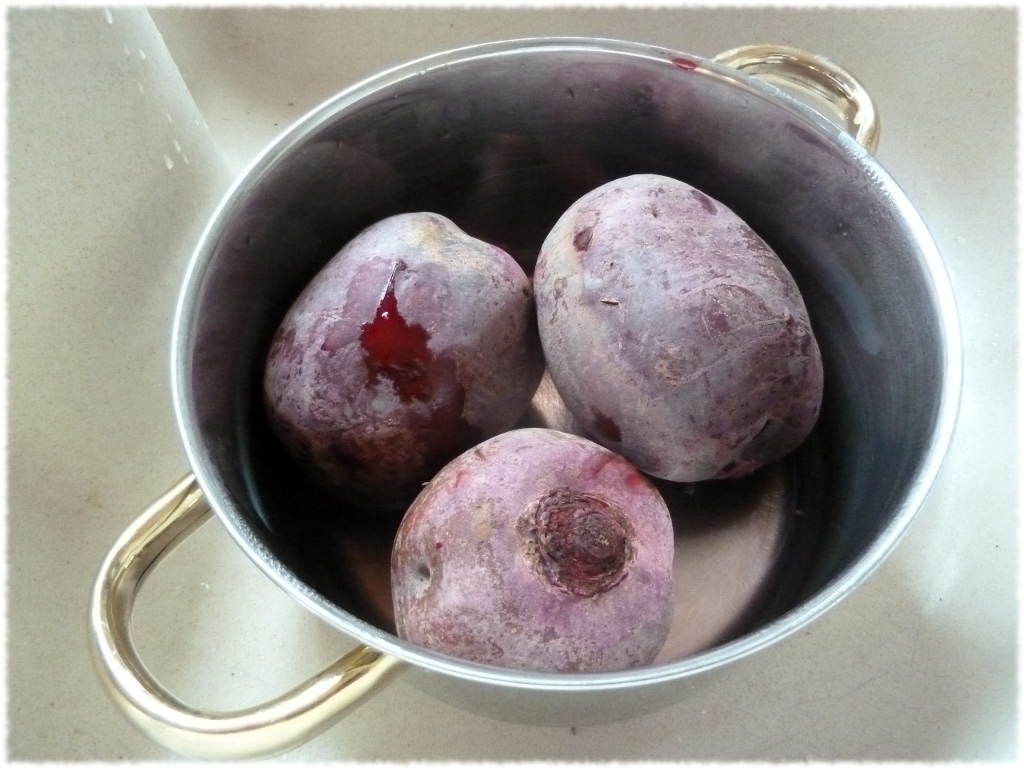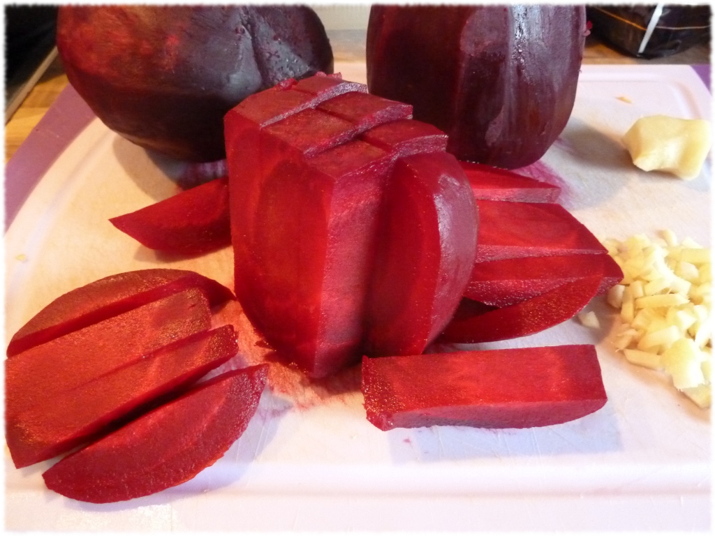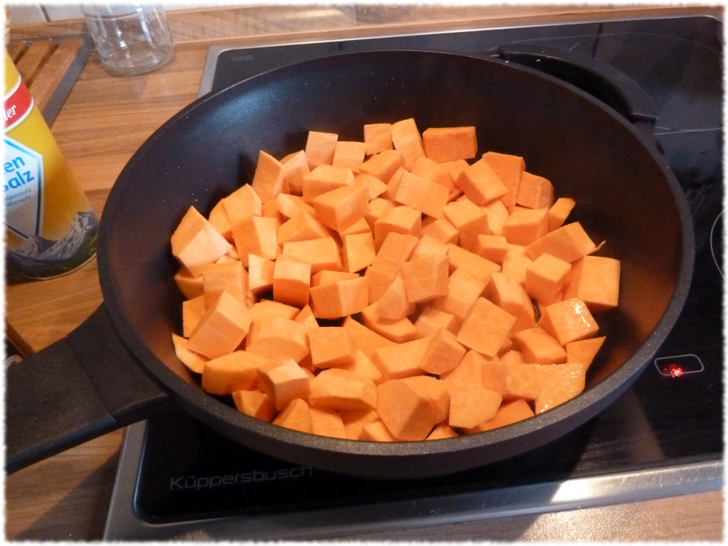 Die rote Bete kochte ich in einem mit Wasser gefüllten Topf ca. 40 min im Ganzen, danach schälen und in Würfel schneiden. Eigentlich habe ich mich immer ein bisschen vor der Sauerei gefürchtet, die Verfärbungen an den Händen und auf dem Schneidbrett waren aber halb so schlimm. Mit ein bisschen Salz und kaltem Wasser abgerieben, war alles ganz schnell wieder sauber. Die Süßkartoffeln habe ich geschält, in Würfel geschnitten und in einer Pfanne für ca. 10 min. angebraten.