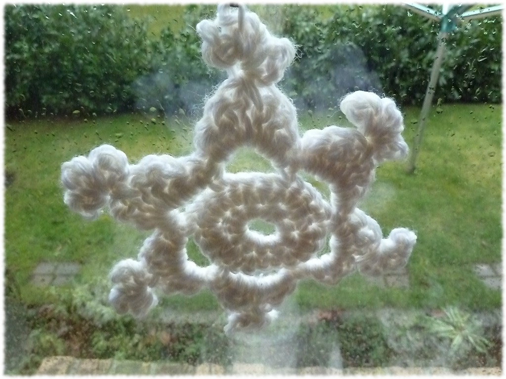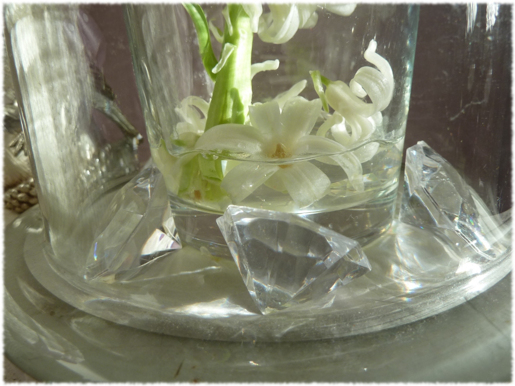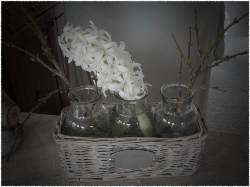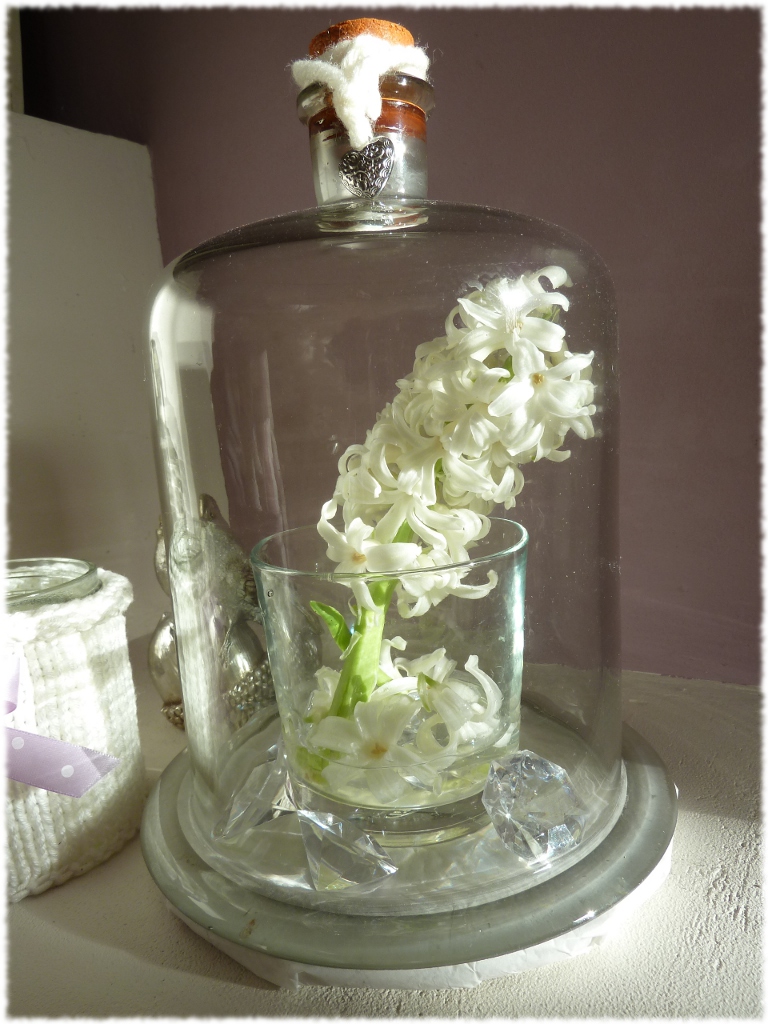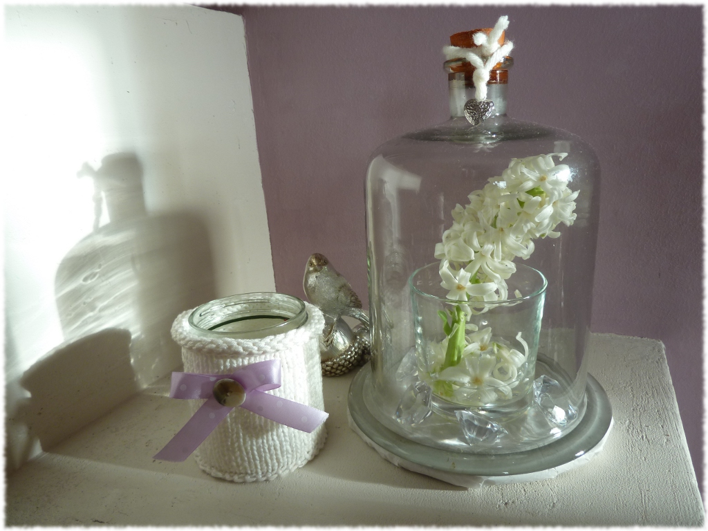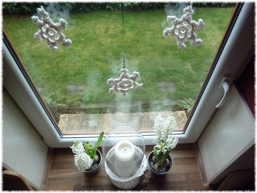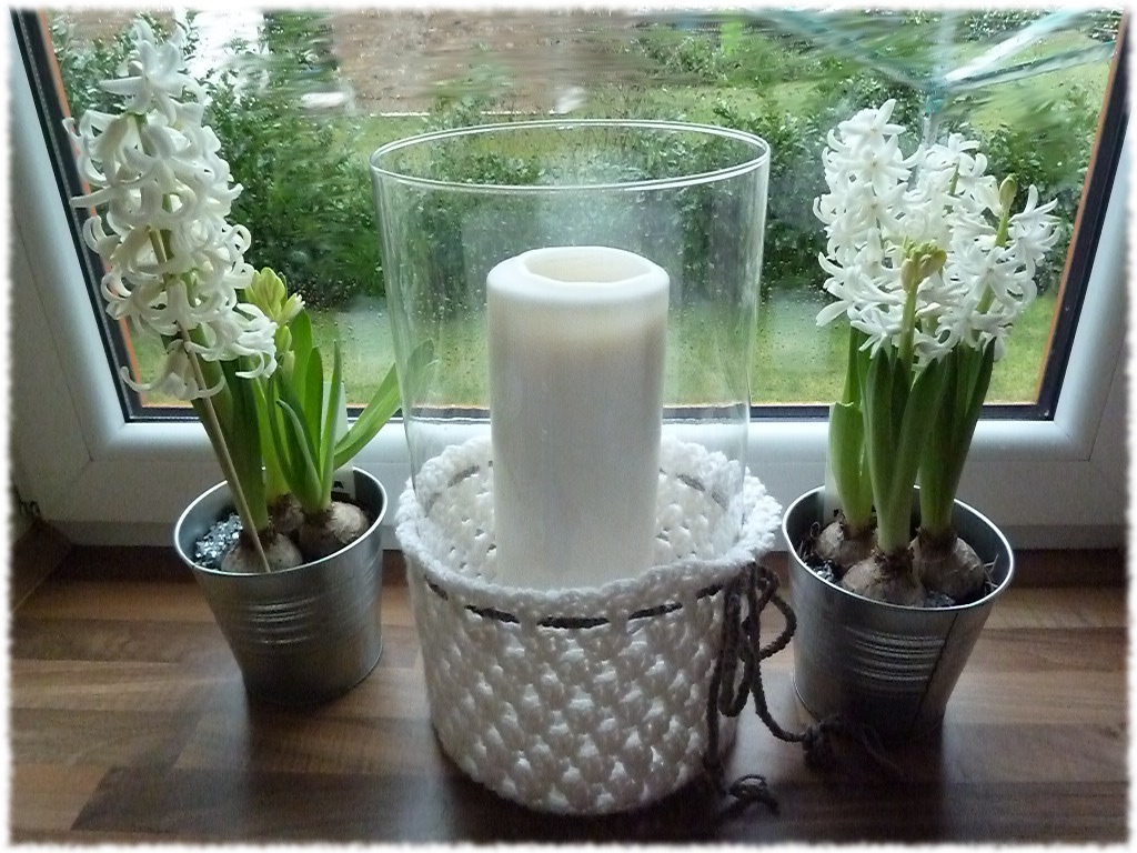Das Wetter, seit Tagen nur Sturm und Regen, präsentiert uns den Himmel in den verschiedensten Grautönen – die Moderatorin von NDR 2 sagt heute so treffend „von seidengrau bis zementgrau“, im Topf köchelte die farbstarke rote Beete und dekotechnisch brauche ich nach Weihnachtszeit und Jahreswechsel etwas Beruhigendes, Cleanes, Weißes eben. Was bietet sich da mehr an als sich erste Frühblüher ins Haus zu holen. Ich weiß nicht, wie es euch geht, aber das Bedürfnis nach frischen Blumen habe ich immer ganz besonders im Januar/Februar, wenn die Blütenpracht draußen noch länger auf sich warten lässt. Daher hier ein paar Fotos mit weißen Hyazinthen, die im Topf am Fenster stehen, abgeschnitten in die Vase oder sogar unter die Haube kommen. Dazu ein paar winterweiße Schneesterne, gehäkelt nach der Anleitung von der lieben Betty (bettys-creations.blogspot.de) Ich habe das Ganze mit 3 Fäden dicker Wolle gehäkelt, so dass es schön groß wird und als Fensterdeko verwendet werden kann. Dazu hat mein dickes Windlicht einen kuschligen Fuß aus dem selben Material bekommen. So stört es uns nicht, dass draußen der Wind heult, drin ist es schön gemütlich.