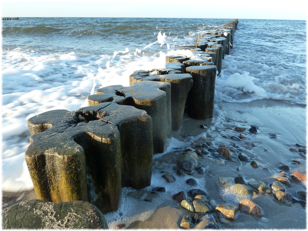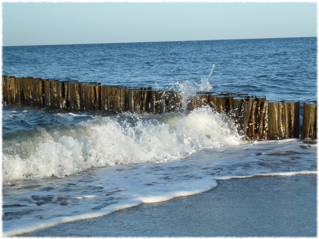 Die Gischt bricht sich an den Buhnen, die mittlerweile blumenförmig aus dem Wasser ragen.