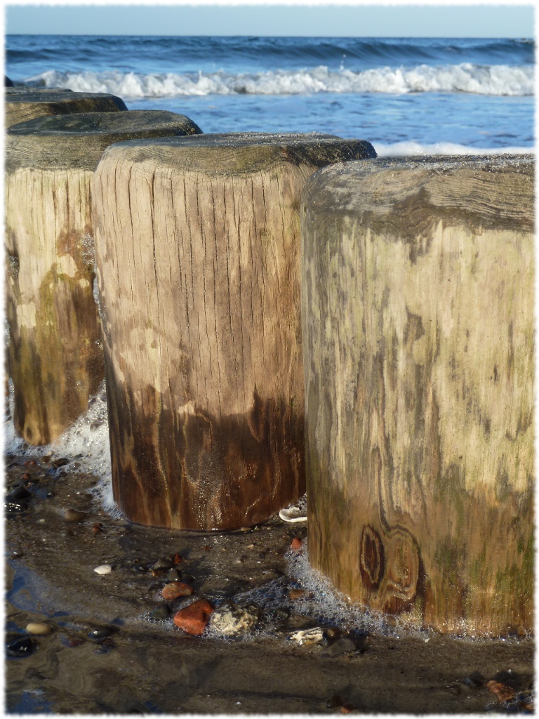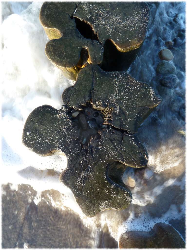 Bei der Suche nach Hühnergöttern habe ich dieses hübsche Herz auf dem Stein entdeckt. Sieht die Maserung der Buhnen nicht toll aus? Eine Buhne stand mitten im Sand.