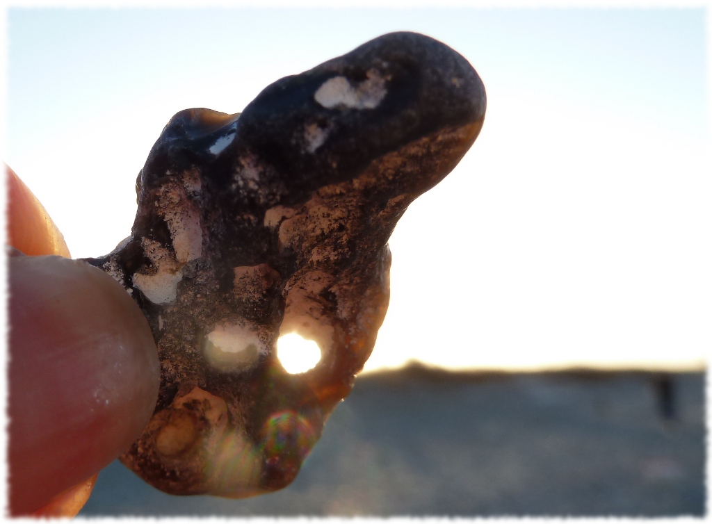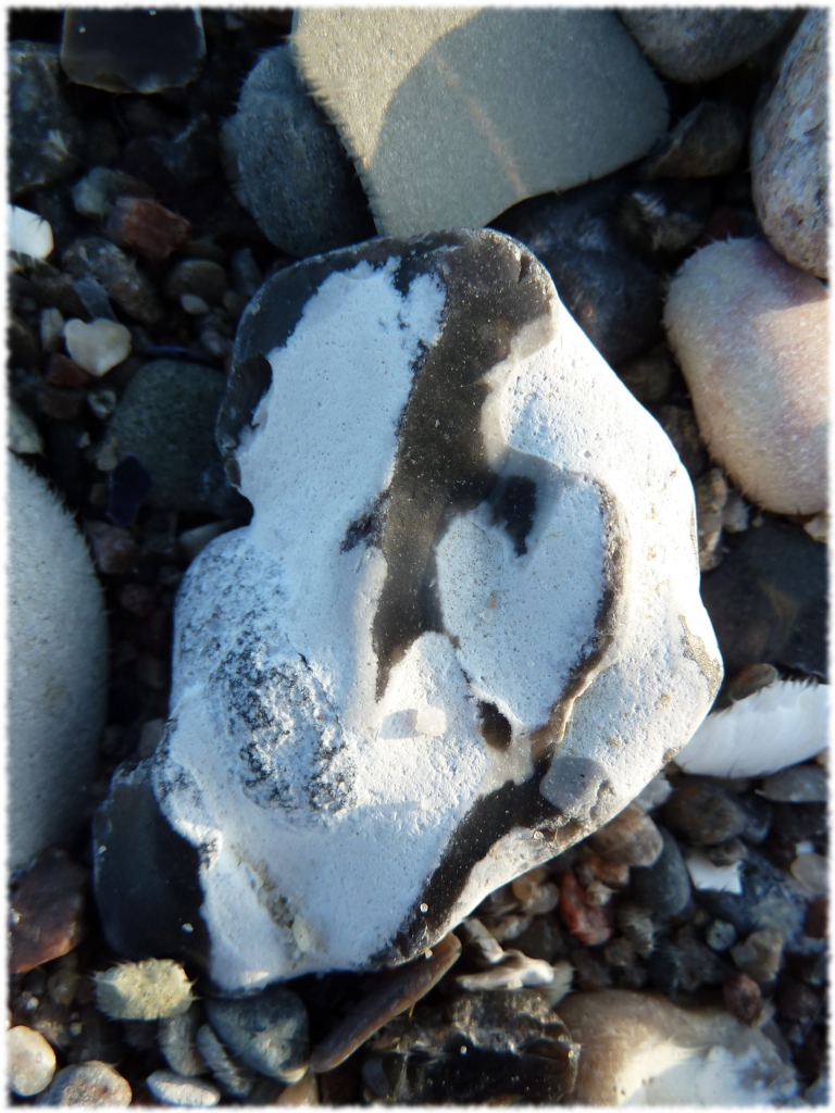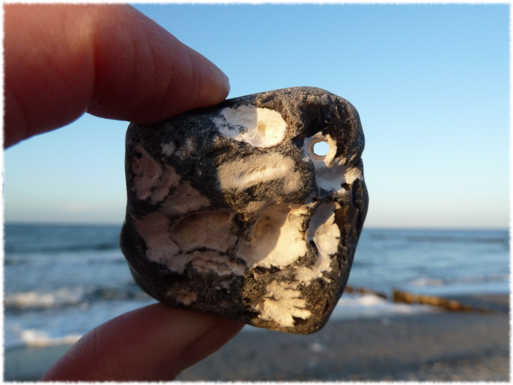 Nach anfänglichem Pech habe ich doch noch 5 Hühnergötter gefunden. Wer die nicht kennt, hier eine kleine Erklärung. Hühnergötter sind Feuersteine mit einem Loch drin. Meistens ist der Kalk vom Meer rausgespült worden. Die wurden früher in Hühnerstelle gehängt, um Unheil abzuwenden. Heute werden sie gern als Glücksbringer gesammelt. Ich musste an Pippi Langstrumpf als Sachensucherin denken.