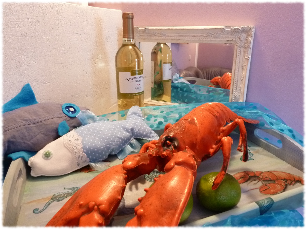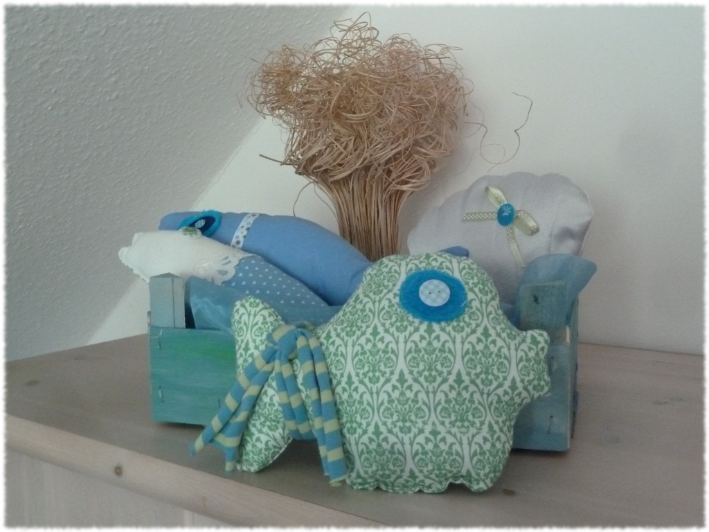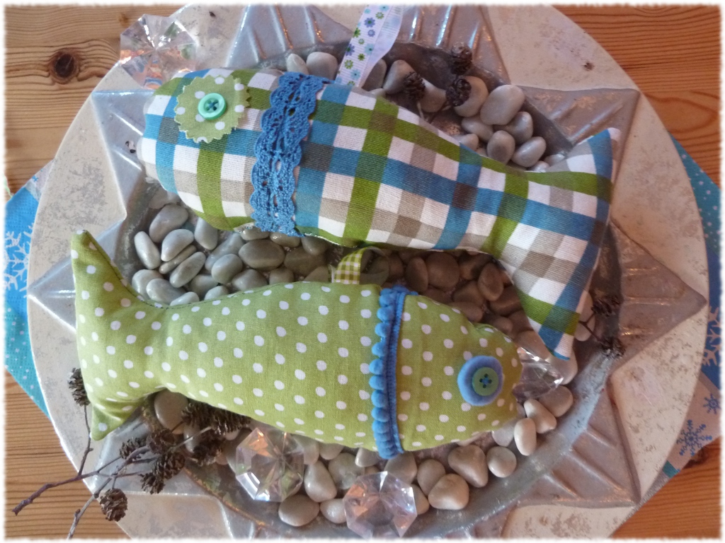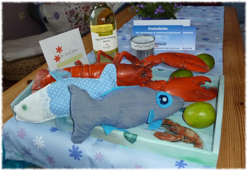 Ein rohes Holztablett habe ich in zarten grünen und blauen Tönen gestrichen. Acrylfarbe ist dafür ideal, weil es nach dem Trocknen auch wasserabweisend ist. Dann ein paar Meerestierchen in Serviettentechnik drauf und trocknen lassen. Mit einem Riesenhummer, einer Flasche Weißwein, ein paar Limetten, etwas blauem Tüll und natürlich mit den genähten Fischen dekoriert, war das Geschenk fertig. Das Geburtstagskind hat sich sehr gefreut.