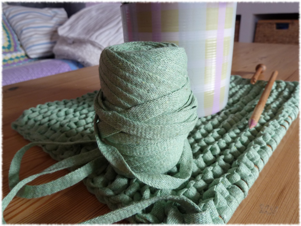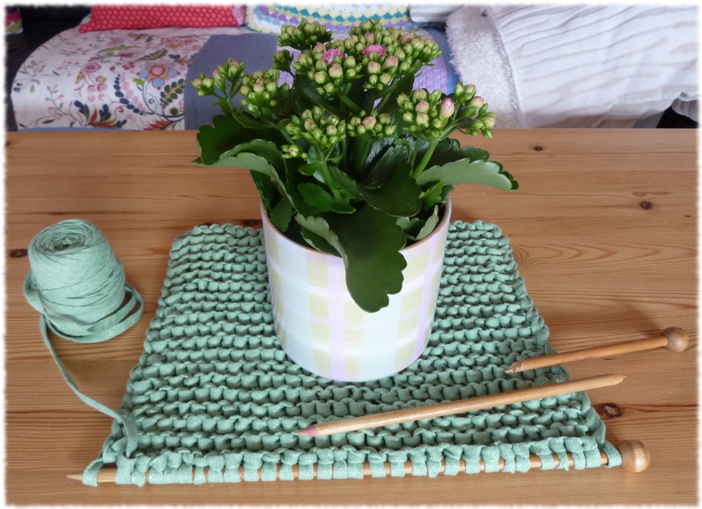 Heute mal ein kleines DIY, was eher zufällig entstanden ist. Ich hatte Lust, eine Kissenhülle aus Bändchengarn zu Häkeln. Hoooked hat da eine schöne Auswahl und die Farbe „mint“ mag ich zur Zeit besonders gern, also Stricknadeln rausgeholt und angefangen. Da mir das Stricken mit Bändchengarn auf die Arme geht, habe ich öfters Pause gemacht und immer nur 2-3 Reihen gestrickt. Leider setzte sich irgendwann ein Familienmitglied (keine Namen :-) ) auf die „Strickstöcker“ (so heißen die bei uns) und so wurde mein Projekt unfreiwillig unterbrochen.