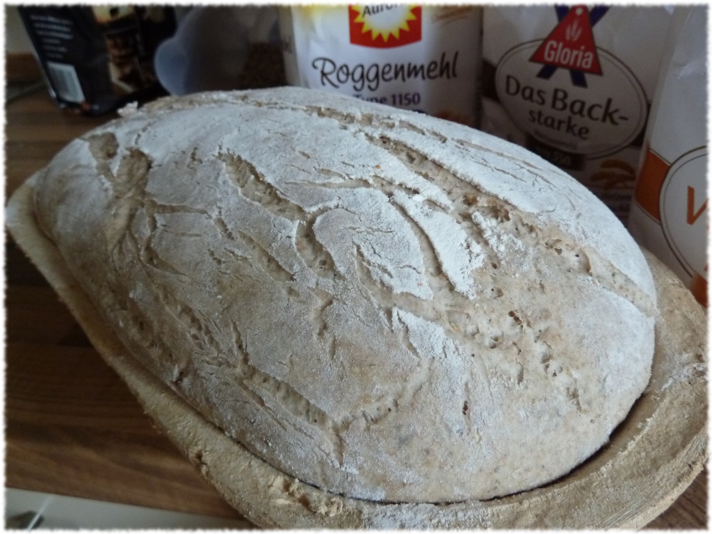 Der Sauerteig darf es sich über Nacht in der Küche gemütlich machen. Morgens dann die Hefe in dem Gerstenmalz auflösen, lauwarmes Wasser dazu und alles zusammen mit dem Sauerteig verrühren. Dann die Mehle, das Salz und die Gewürze gut unterkneten und für ca. 1h an einem warmen Ort gehen lassen. Jetzt den Teig auf einer bemehlten Unterlage durchkneten und in ein Gärkörbchen legen. Ja, ich bin stolzer Besitzer eines solchen nützlichen Utensils. Ein guter Freund dachte beim Auflösen einer Bäckerei an mich und wieder einmal ein faszinierendes Beispiel dafür, dass eine kleine Aufmerksamkeit viel Freude machen kann und das abwarten manchmal die bessere Alternative ist. Ich hatte noch kein Gärkörbchen, weil es eben nicht einfach so nebenbei in den Einkaufskorb geschmissen ist. So, wir wollen aber nicht abschweifen. Sicherlich ist das Brot jetzt schon schön aufgegangen, kann aufs Backblech mit Backpapier drunter und mit ein paar Einschnitten in der Oberfläche geht es bei ca. 210 Grad in den Ofen. Hier backt es ca. 50 Minuten. Wie immer von unten testen, ob es hohl klingt. Dann ist es gut und kann nach ein paar Stunden Abkühlzeit aufgeschnitten werden. Mit Schnittlauchquark ist es ein Gedicht! Sicherlich fallen euch da viele andere Serviervorschläge ein. Guten Appetit!