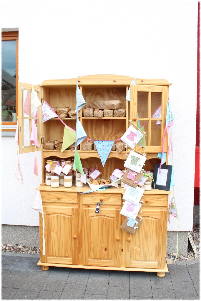 Ein Glücksfall war dieses tolle Küchenbuffett, das gerade bei einer Küchenrenovierung „übrig“ war. Es war einfach perfekt für unsere selbstgebackenen Brote und den Backmischungen für Cookies und Schokoladenkuchen, liebevoll verpackt und dekoriert. Das Küchenbuffett stand auch zum Verkauf und wechselte ziemlich schnell den Besitzer. Glück, dass der neue Besitzer auch ein Nachbar ist, nur für den Fall, dass wir es noch einmal brauchen werden :-).