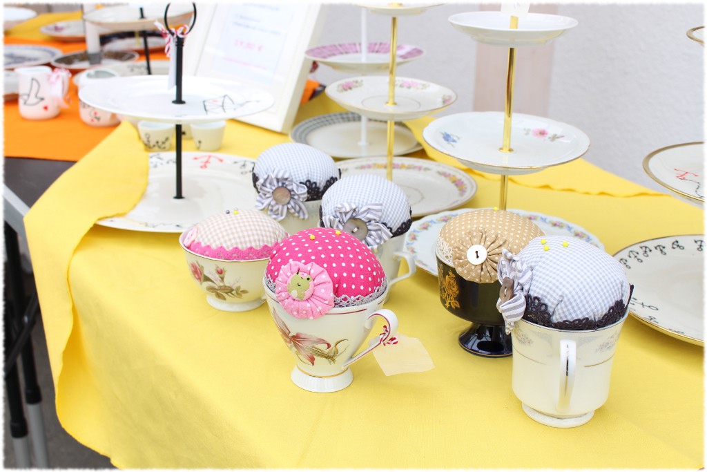 Die schicken Etageren und Nadelkissen in der Tasse stammen von einer Freundin, die ihre Unikate im Onlineshop Porzellangeschichten verkauft.