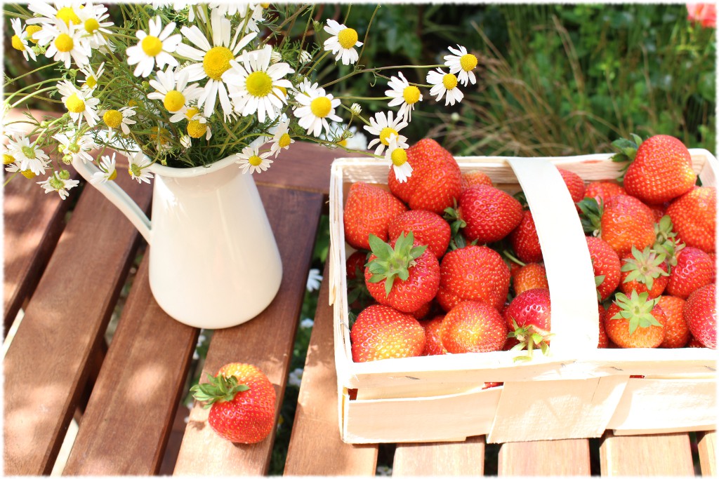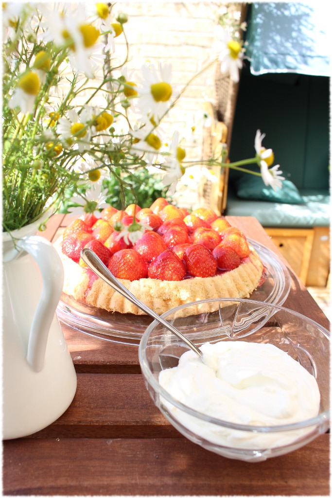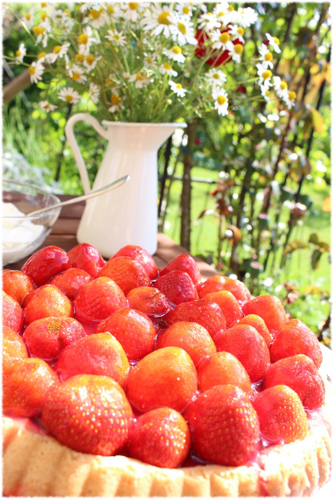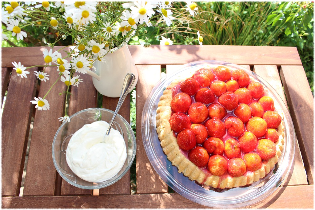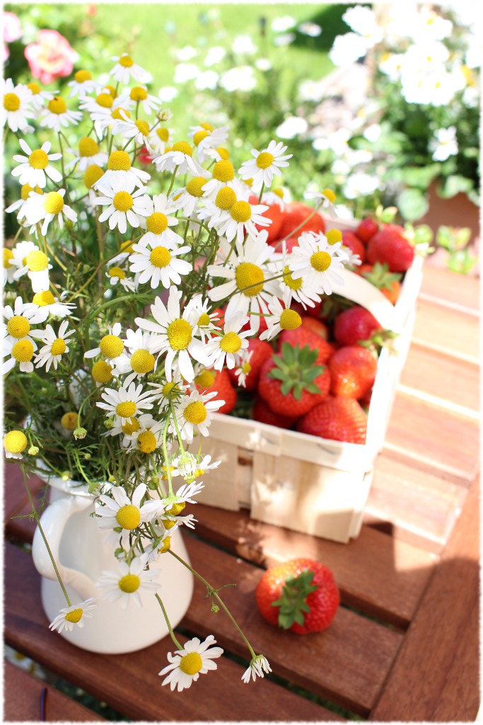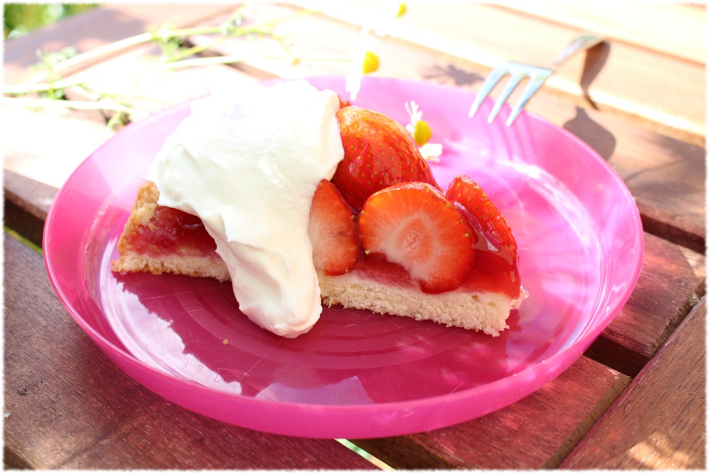 Den ausgekühlten Boden mit frisch gepflückten Erdbeeren belegen. Ich nehme immer gern ganze Früchte. Dann einfach Tortenguß aufkochen und die Torte damit begießen, im Kühlschrank fest werden lassen. Jetzt in die Sonne setzen, die Torte auf quietschbunten Tellern servieren und genießen. Unbedingt Schlagsahne dazu reichen! Gut, dass wir niemanden eingeladen haben, die Torte war genau richtig für 4 hungrige Familienmitglieder. Die Kamille gab es auf dem Erdbeerfeld gratis dazu :-). Ab damit aufs Foto!