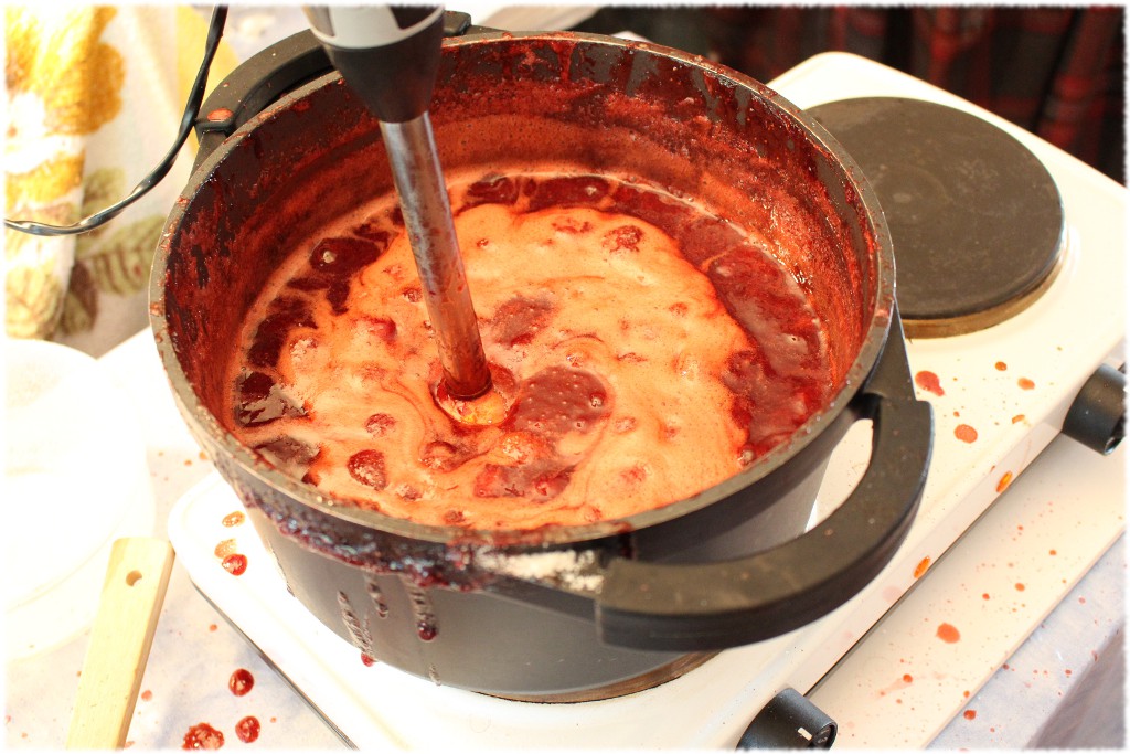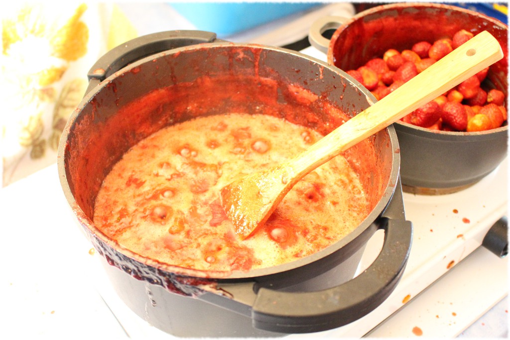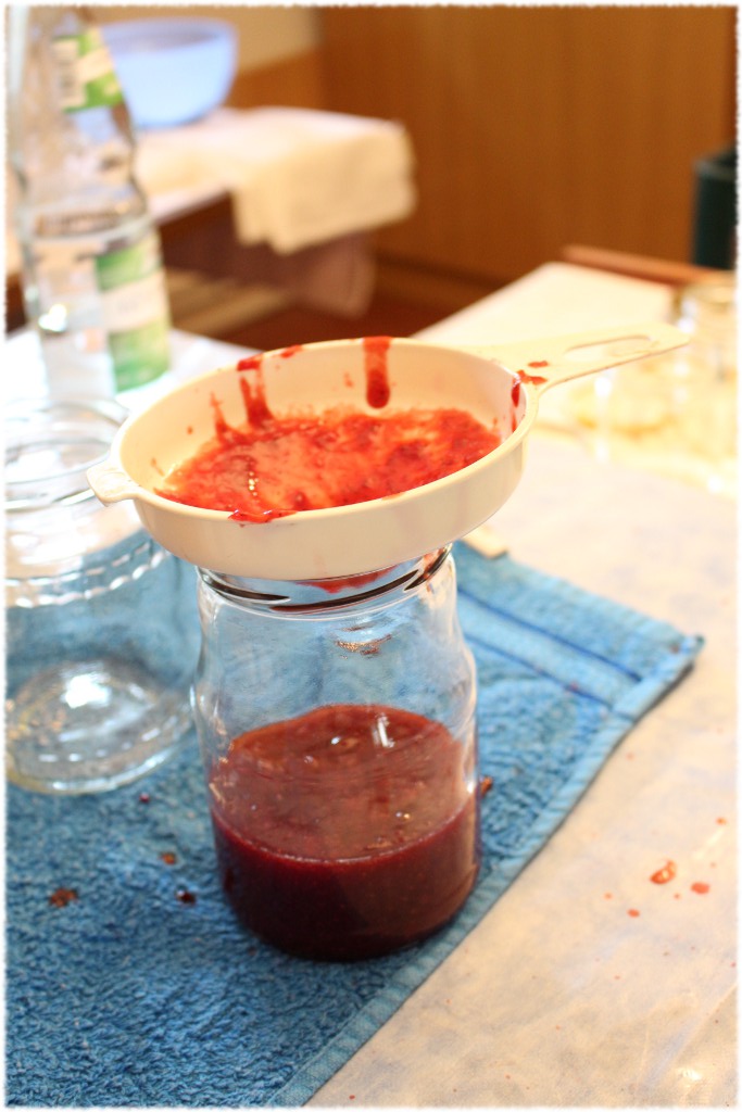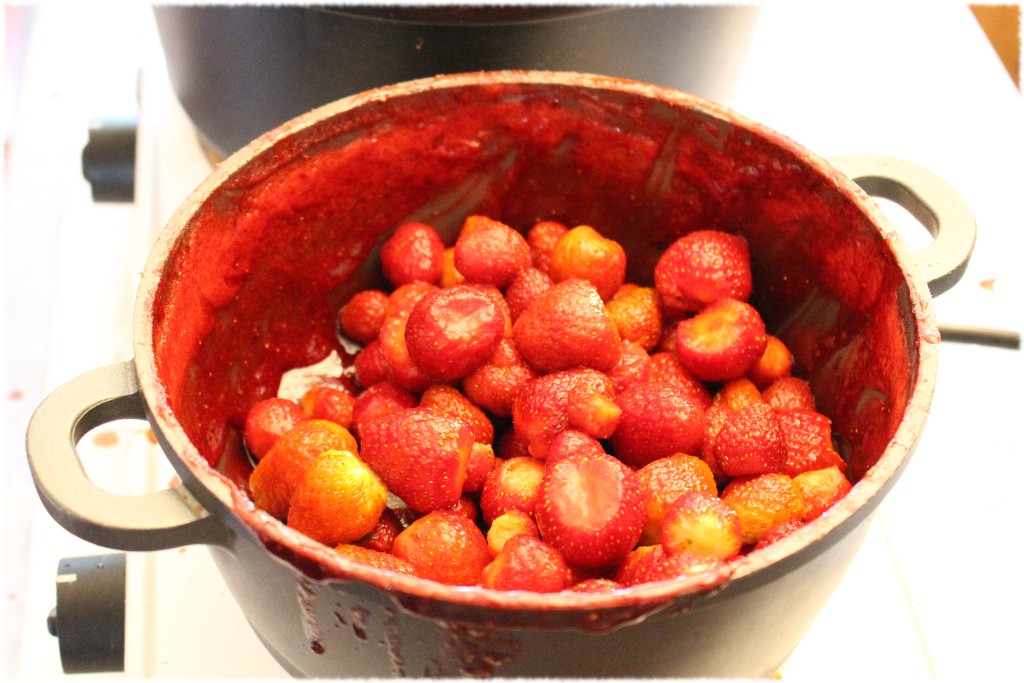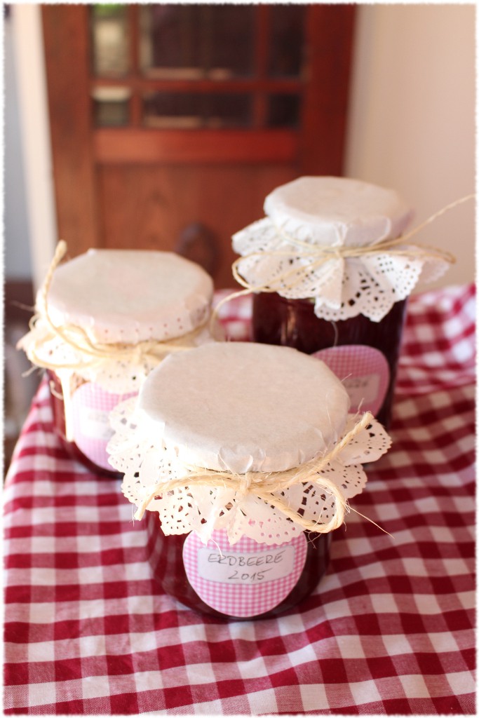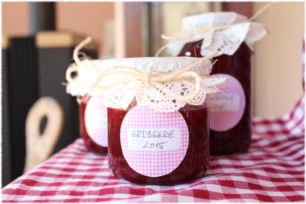 Bei Erdbeermarmelade bin ich übrigens ein Verfechter des klassischen Rezeptes. Ich mag da keine Experimente mit Holunderblüten, Minze, Caipirinha u.ä. und bloß keinen Gelierzucker. Unser Familienrezept lautet folgendermaßen: 1 kg Erdbeeren wird mit dem Kartoffelstampfer leicht angedrückt, damit Saft austritt. Jetzt ca. eine Viertelstunde kochen und dann 500 g Zucker dazu, sprudelnd kochen lassen, dann geht es schneller, kleckert leider aber auch mehr. RÜHREN, RÜHREN, RÜHREN! Zum Schluss die Masse mit dem Pürierstab je nach Gusto zerkleinern. Da unsere Kinder keine Stückchen mögen, pürieren wir sehr fein. Nach jahrelanger Erfahrung wissen wir (also meine Mama), wann wir fertig sind. Die Masse muss schön cremig sein. Wer unsicher ist, lässt ein wenig Marmelade auf einem Teller aus dem Gefrierfach abkühlen und bestimmt so den optimalen Grad der Konsistenz. Und bitte die Zutaten nicht verdoppeln oder verdreifachen. Es dauert dann unnötig länger und die Marmelade verliert ihre schöne rote Farbe.