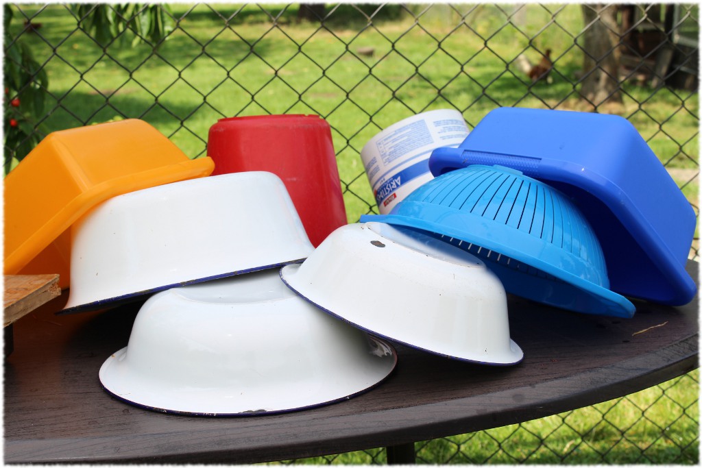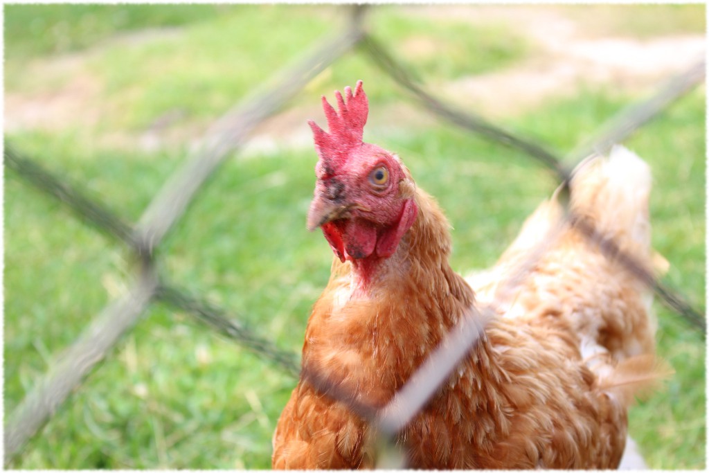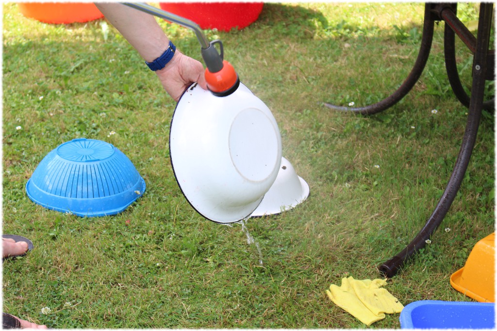 Die Hühner waren scharf auf jede olle Erdbeere, die wir über den Zaun warfen. Die Schüsseln wurden nach getaner Arbeit abgespült. Das Wasser darin wurde über den Zaun geplatscht. Herrlich, wie die Hühner aufgeschreckt wurden. Leider gibt es davon kein Bild.