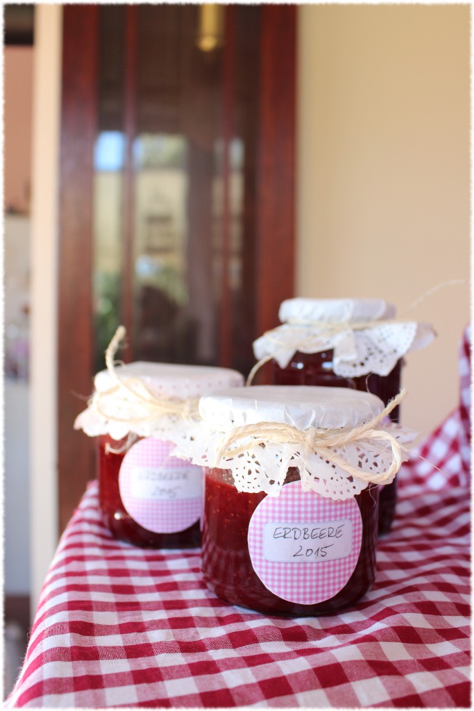 Letzten Sonntag sind wir bei brütender Hitze zu Onkel und Tante gefahren. (Ich habe von meiner lieben Tante Ursel schon in einem vorangegangenen Post über Plätzchen berichtet.) Jedes Jahr fahren wir zur Erdbeerernte und kochen einen Tag gemeinsam mit meinen Eltern den Jahresvorrat an Erdbeermarmelade. Ja, es war wirklich heiß, aber die Erdbeeren warten nicht! Also frisch ans Werk, die Erdbeeren waren von meinem Papa schon fast fertig gepflückt. Wir pulten die Stempel raus, zogen zum Marmeladekochen unsere Herdplatte plus Verlängerungskabel aus dem Kofferraum und verschwanden auf der Tenne. Unsere Marmeladenschlacht in diesem Raum hat sich über Jahre bewährt. Erstens ist die Tenne schön kühl, zweitens bleibt die Küche verschont von unseren reichhaltigen Kleckereien bzw. kann für die regulären Mahlzeiten genutzt werden und drittens haben wir genug Platz für Zutaten, Schüsseln, Gläser usw.