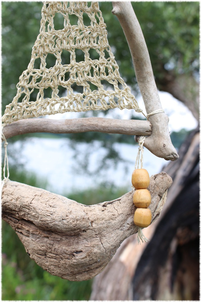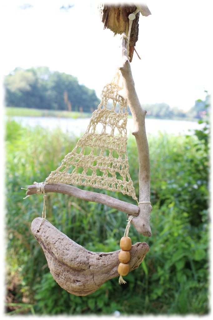 Ich habe zwei von Salzwasser und Sonne verblichene Aststücke verschrauben lassen. Ja, da muss immer mein lieber Mann ran, das kann er einfach besser :-). Nach einer aus Papier ausgeschnittenen Schablone häkelte ich das Segel mit Stäbchen und Luftmaschen, dass sich nach oben hin verjüngt. Dabei habe ich immer in jeder 2. Reihe eine Masche rechts und links übersprungen, das passte in diesem Fall. Das Segel habe ich dann an meine Astgabel geknüpft und ein Stückchen Strandgut in Bootsform mit dem gleichen Sisalgarn unten rangeknotet, 3 Holzperlen aufgefädelt und verknüpft, Schlaufe oben und fertig ist das Bötchen zum Aufhängen.