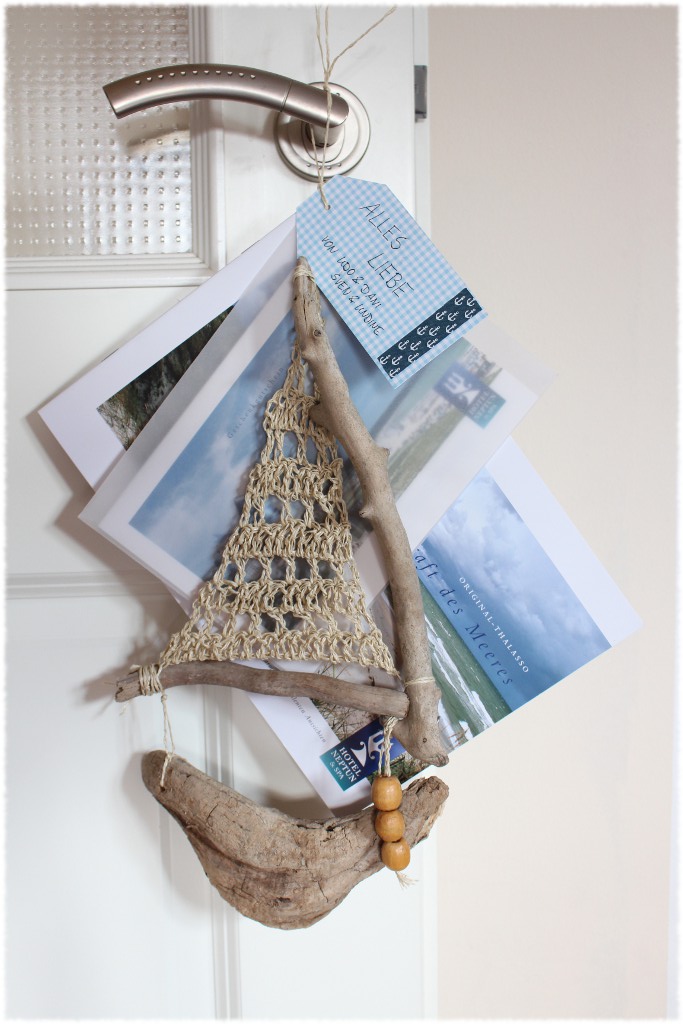 Das aber nur am Rande. Eigentlich möchte ich zur Überschrift passend mein letztes Bastelprojekt vorstellen. Wir waren zu einem 40. Geburtstag eingeladen und der Gutschein, den wir verschenkten, hat mit Warnemünde, einem schönen Hotel dort und natürlich mit dem Meer zu tun. Dazu passend wollte ich etwas im maritimen Stil gestalten. In der letzten „Landlust“ hatte ich gesehen, wie aus einer Astgabel und einem gebogenen Stück Holz ein Segelboot gebaut wurde. Mit meinen letzten Funden vom Strand, Sisalgarn und Häkelnadel habe ich eine Abwandlung dieses Bootes gebastelt.