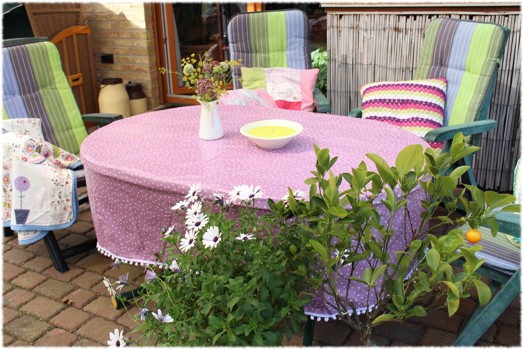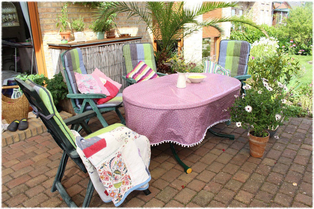 Meine Variante einer windsicheren Tischdecke ist eine Husse, die passgenau für den Tisch genäht wird und aus dreijähriger Erfahrung kann ich euch sagen: „Die ist absolut windsicher!“ Gerade habe ich eine fliederfarbene Pünktchenvariante mit Bommelborte vollendet. Ich lege immer den Tisch verkehrt herum auf das Wachstuch, schneide das dann zu und nähe einen Streifen von ca. 40 cm in der Länge des Umfangs um das oval zugeschnittene Tuch. Bei viereckigen Tischen ist es sicherlich noch einfacher. Da braucht man nur Länge und Breite des Tisches abmessen und kann dementsprechend zuschneiden. Wenn man eine Tischdecke aus Stoff näht, empfehle ich auf den langen Seiten kleine Taschen ran zu nähen. Dort kann man dann Steine als Beschwerer einfüllen und dann sind sie noch windsicherer.