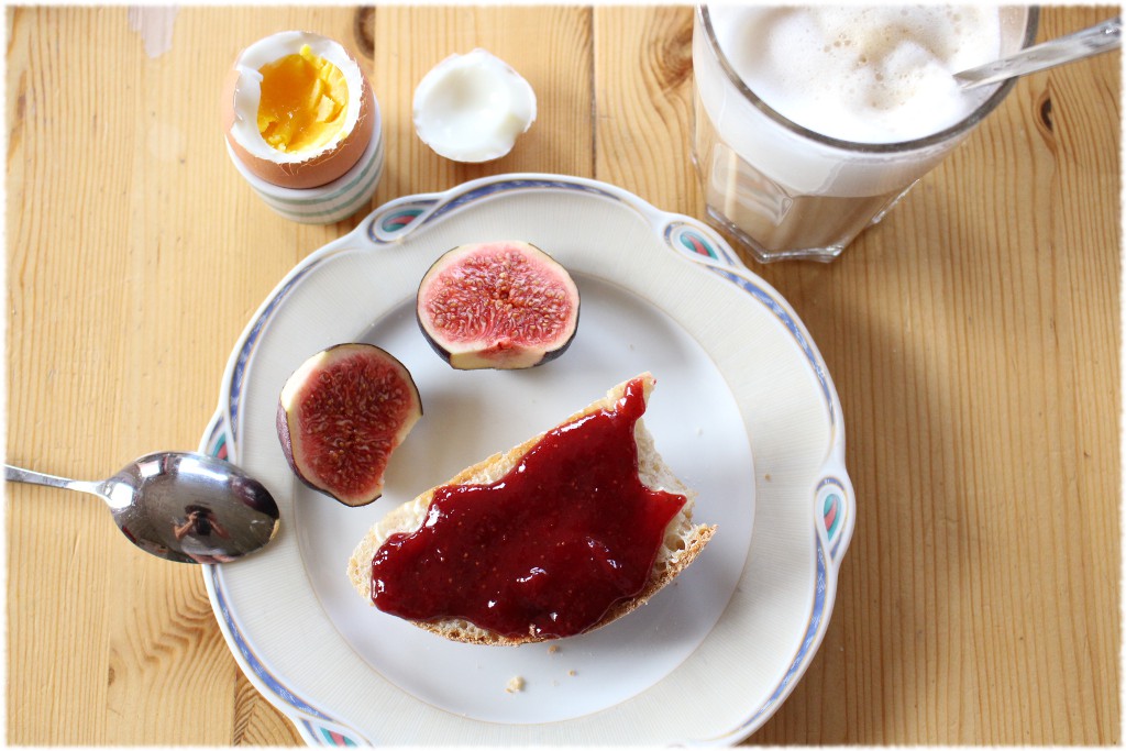 So, und dann einfach nur genießen, am liebsten mit Erdbeermarmelade, Ticker-Ei, Feigen und Latte Macchiato.