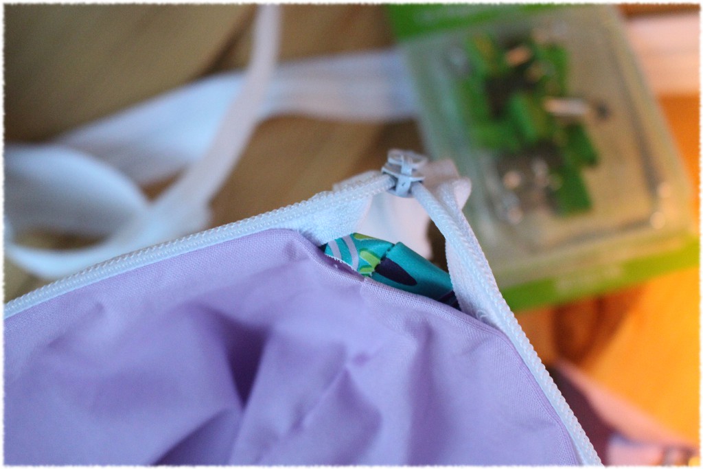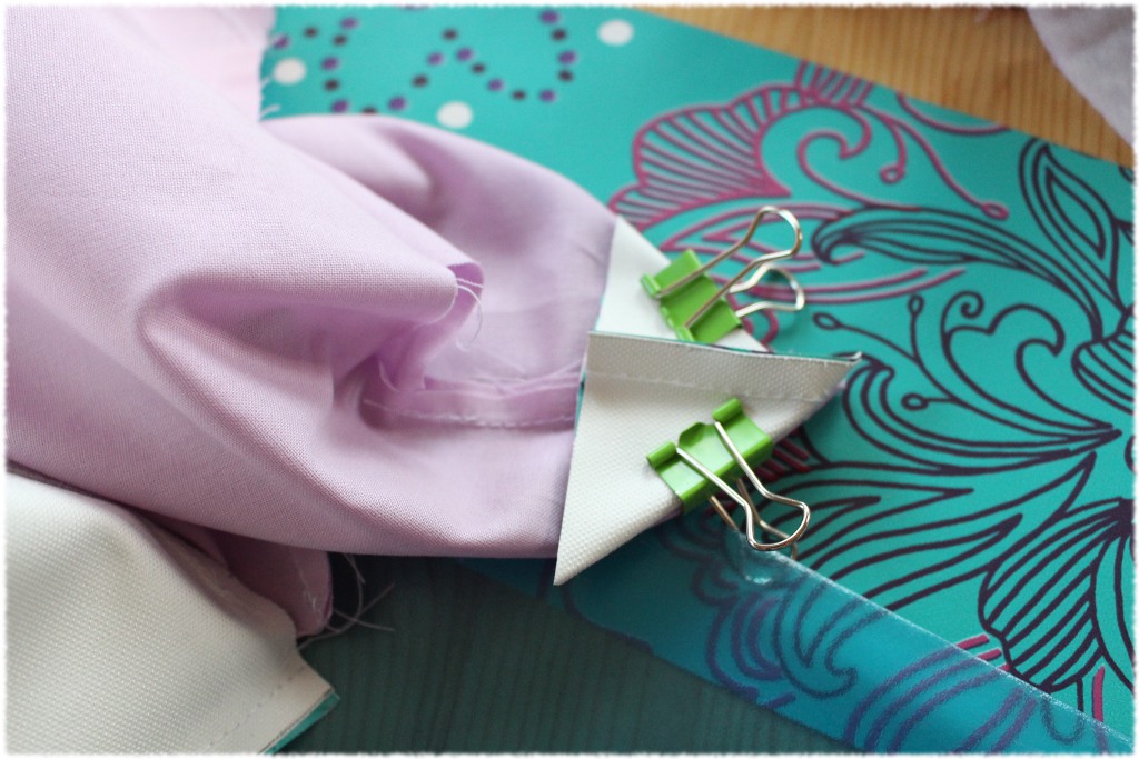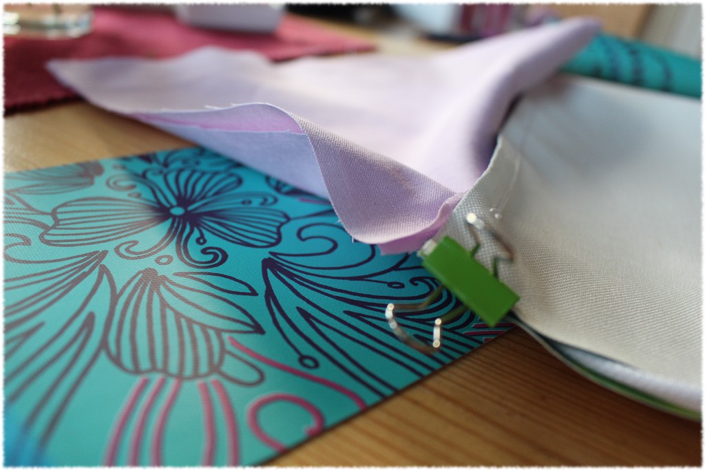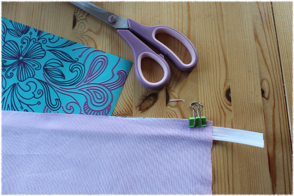 Sogenannte Papierklammern leisten tolle Dienste beim Nähen von Wachstuch, da Stecknadeln unschöne Löcher hinterlassen würden. Der Reißverschluss ist jetzt zwischen den Lagen festgenäht.
