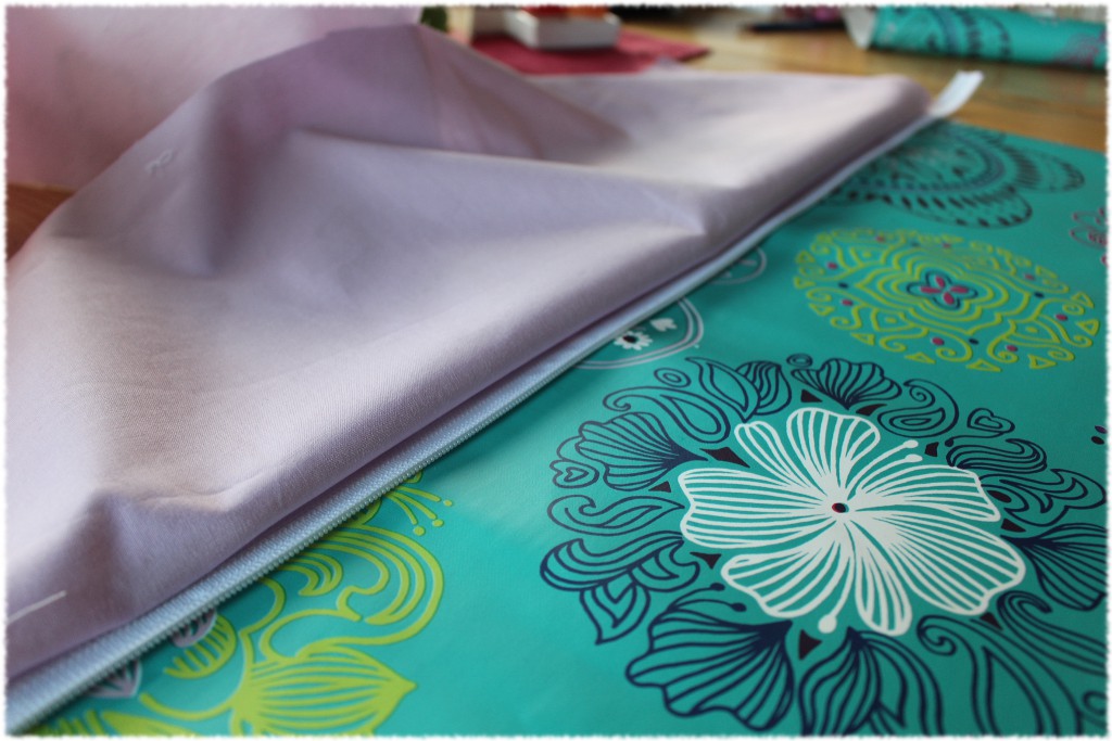 Im Großen und Ganzen folgte ich der Anleitung von Anna von Noodlehead. Nur schnitt ich das Wachstuch und den Futterstoff in einem Stück zu (Größe 63 x 22 cm) und nähte statt einem „normalen“ Reißverschluss ein Stück Endlosreißverschluss über die gesamte Länge der Tasche ein. Das spart zum einen eine Naht und zum anderen sieht der Abschluss (da wo der Reißverschluss zugemacht wird) sehr ordentlich aus, da dieser hier ordentlich um die Kurve verläuft und keine Enden zwischen Futterstoff und Wachstuch reingefummelt werden müssen.
