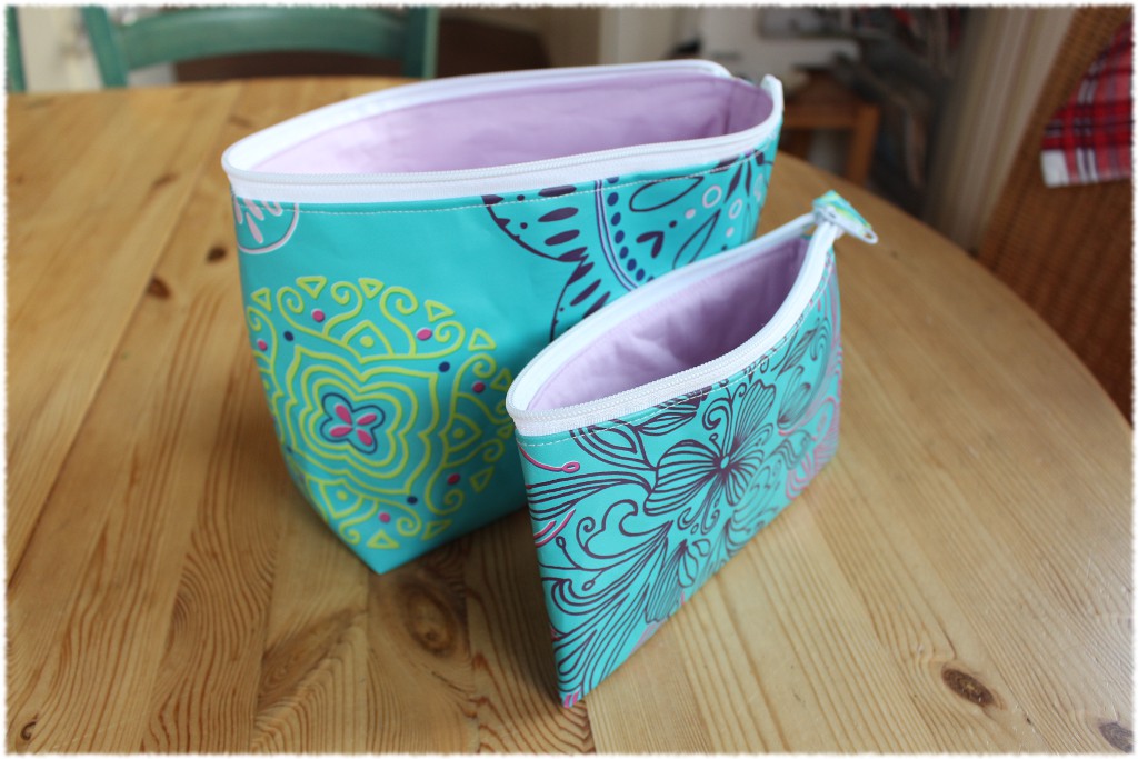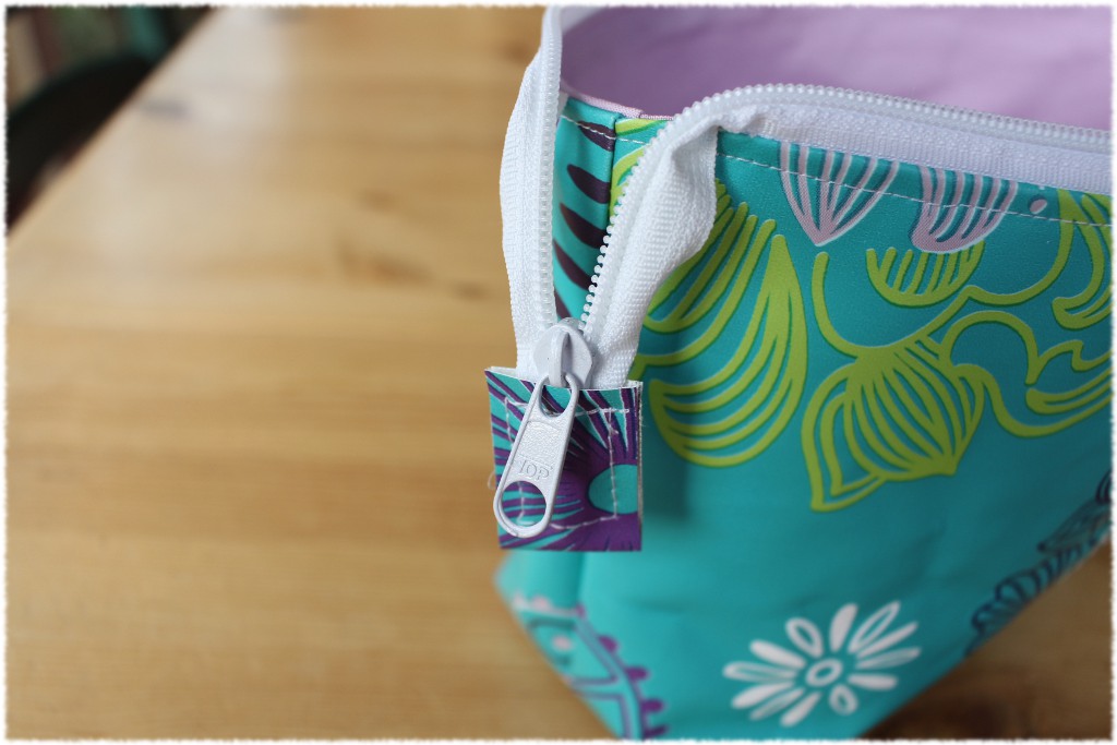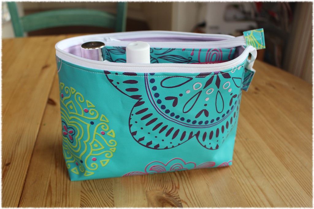 Auf der Suche nach einem schönen Kosmetiktäschchen ist mir dieses Open Wide Zippered Pouch untergekommen. Die Idee, die Tasche weit öffnen zu können um den Inhalt zu inspizieren, gefiel mir gut. Dann noch ein bisschen Blog-Hoping und ich stieß auf die Seite von Jubelis, wo es sehr schönes Wachstuch zu annehmbaren Preisen gibt. Also nicht lang gefackelt und ein kleines Päckchen bestellt. Dieses etwas dickere Wachstuch mit großen Blumen hatte es mir angetan und wurde gleich verarbeitet.