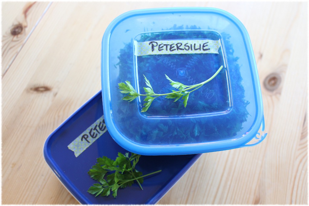 … und wir Menschen unsere Gefriertruhe :-). Dieses Jahr gedieh die Petersilie besonders gut und bevor der erste Frost alles platt macht, hieß es husch, husch ins Körbchen. Ich habe die abgeschnittene Petersilie gut gewaschen und in der Salatschleuder gut getrocknet. Das ist wichtig, sonst friert das verbleibene Wasser die Petersilie zu einem Klumpen. Dann kam der meditative Teil: Die guten in die eine Schale die schlechten Stengel in die andere. So hat man wirklich 1A Bioware sortiert. Der Rest ist einfach: Kleinschneiden, eintuppern und Dosentetris im Tiefkühler spielen. Ihr kennt das bestimmt, Platz ist da nie!