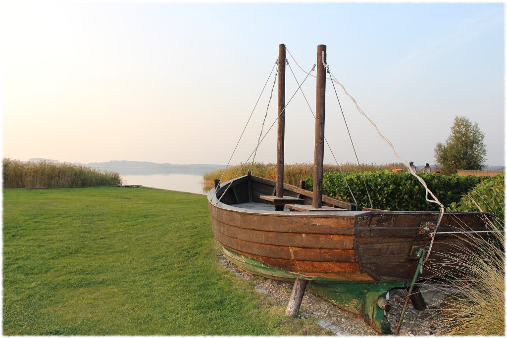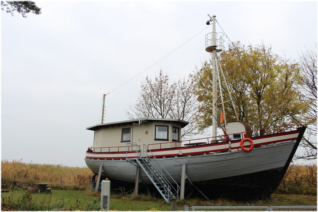Ein Wohnschiff am Achterwasser. Hier möchte man doch gern Urlaub machen, oder? Der Ast lag auf dem Radweg, ursprünglicher geht es doch kaum.
