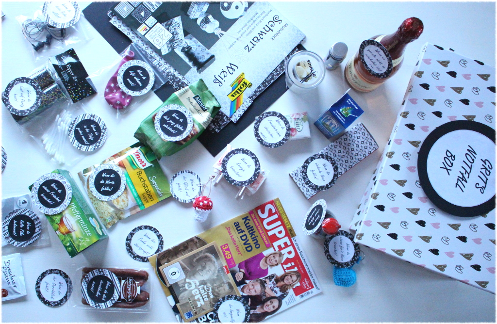 Was würde euch noch so für eine Notfallbox einfallen? Ich könnte mir noch Konfetti vorstellen, wenn es mal nicht so rund läuft oder Enthaarungscreme, wenn es mal zu haarig wird. Ersetzen könnte man auch die Kopfhörer mit Ohrstöpseln, Sekt mit Brausepulver und Q-Tips mit Zahnstochern. Für Schokoladenliebhaber müsste diese unbedingt enthalten sein, wenn nur Süßes noch hilft, oder so.
