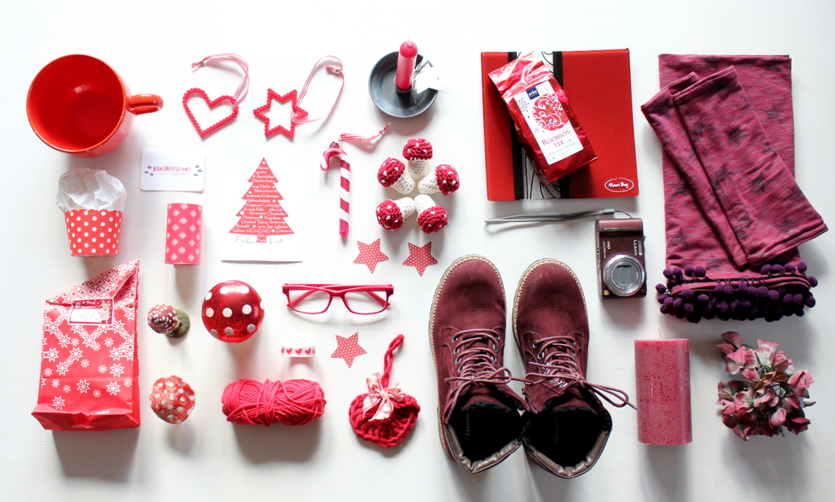 Die Monatscollage von Rösi begleitete mich das ganze Jahr 2017. Jeden Monat konnte man einen Farbübergang mit Alltagsgegenständen gestalten und ich gebe zu, dass mir das großen Spaß gemacht hat. Erstaunlicherweise findet man im Haushalt doch alle Farben und schnell waren die Kleinigkeiten, egal ob Haushaltshelfer, Stehrumchen, Lebensmittel und und und zusammengesucht und von oben fotografiert. Wenn noch Gegenstände fehlten, half immer ein Blich in das Nagellackregal vom Töchterchen oder in meinen Wollkorb. Da war immer noch etwas zu der entsprechenden Farbe zu finden. Naja, ich gebe zu, ich lebe doch in einem recht farbenfrohen Haushalt, da ist es dann doch relativ einfach. Im Dezember nun durfte man seine Lieblingsfarben nehmen. Bei mir ist das eindeutig ROT. Ich liebe diese Signalfarbe in allen Schattierungen von knallrot bis weinrot. Nicht nur zu Weihnachten mag ich diese Farbe, die Energie, Intensität und Wärme ausstrahlt. Sie begleitet mich z.B. kleidungstechnisch das ganze Jahr. Egal, ob als hellroter Jerseyrock oder als Loop-Stulpen-Set oder Booties wie auf dem Foto. Hier also meine persönliche 5-Minute-Collage im Dezember: