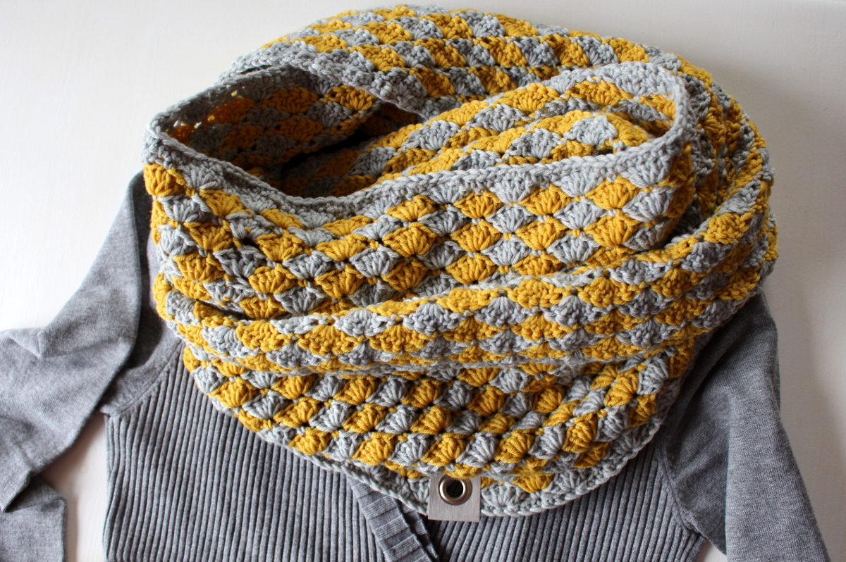 Loop-im-Muschelmuster-gehäkelt-senfgelb-grau-Merinowolle10
