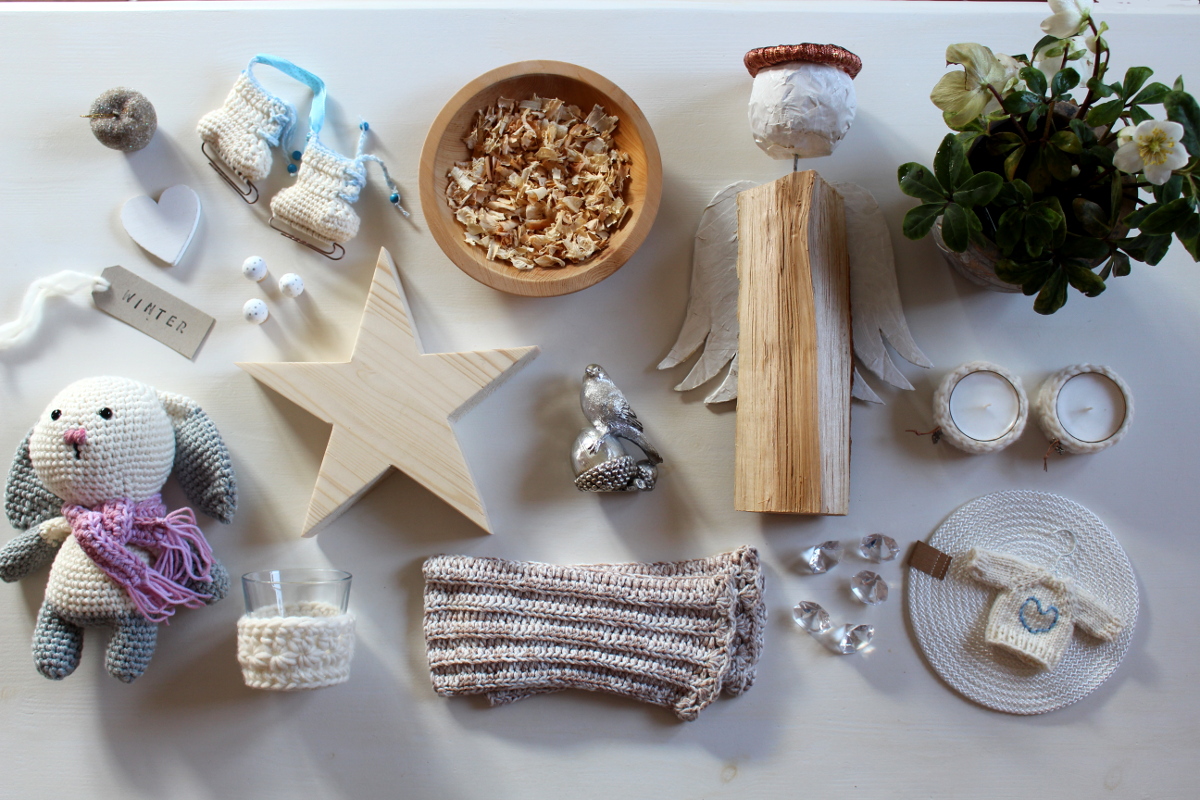 Collage2018-WinterKuschelige, warme Materialien, helles Holz und eine Christrose sind für mich die perfekten Dekobegleiter im Winter. Die Stulpen halten mich schön warm und auf dem Untersetzer, der übrigens von Karin in unserem Adventskalender war, gehört eine Kanne Tee. Dann kann man in der kuscheligen Höhle zu Hause den Winter überstehen, häkeln, nähen und stricken. Die Schale aus Zirbelholz ist übrigens ein ganz aktuelles Geschenk, da wir Nachbars Kater und die Hasen während des Urlaubs gepflegt haben. Die Späne duften ganz wunderbar nach Holz. Das kleine Winterhäschen habe ich nach dieser Anleitung gehäkelt und es fühlt sich ganz wohl bei uns auf der Couch.