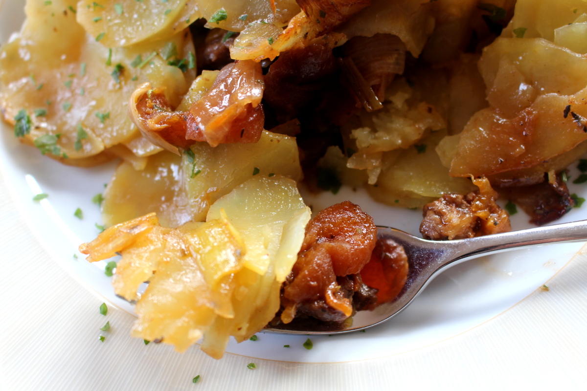 Rindfleischtopf-mit-Porree-getrockneten-Aprikosen-und-Kartoffelhaube18Das Besondere an dem Gericht ist die Kombination aus Rindfleisch, Porree, Zwiebeln und Aprikosen. Von je her liebe ich deftige Rezepte, die eine liebliche Komponente haben. Wenn es dann noch ein bisschen scharf ist, um so besser. Das Ganze wird mit einer knusprigen Kartoffelhaube gekrönt und ist so praktisch einen Eintopf, wenn auch etwas anders als man das sonst kennt. Aber von vorn: hier die Zutaten und die Zubereitung: