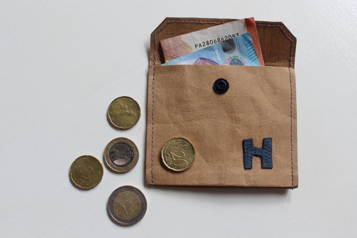 Als Material habe ich wieder SnapPap genommen. Das Material lässt sich gut verarbeiten, ist stabil und mit seinem lederartigen Design gut für Jungs geeignet. Damit das Geschenk einen individuellen Touch bekommt, habe ich noch den Anfangsbuchstaben des Beschenkten aus Leder geschnitten und vorn aufgenäht. Die Börse wird mit einem KamSnap geschlossen und ist mit 3 Nähten ultraschnell fertig.