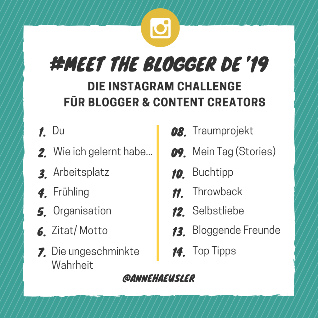 Heute mal ein Aufruf für die Gelegenheit Blogger im deutschsprachigen Raum kennenzulernen. Anne Häusler lädt auch in diesem Jahr wieder zur Instachallenge #meetthebloggerde19 ein.
