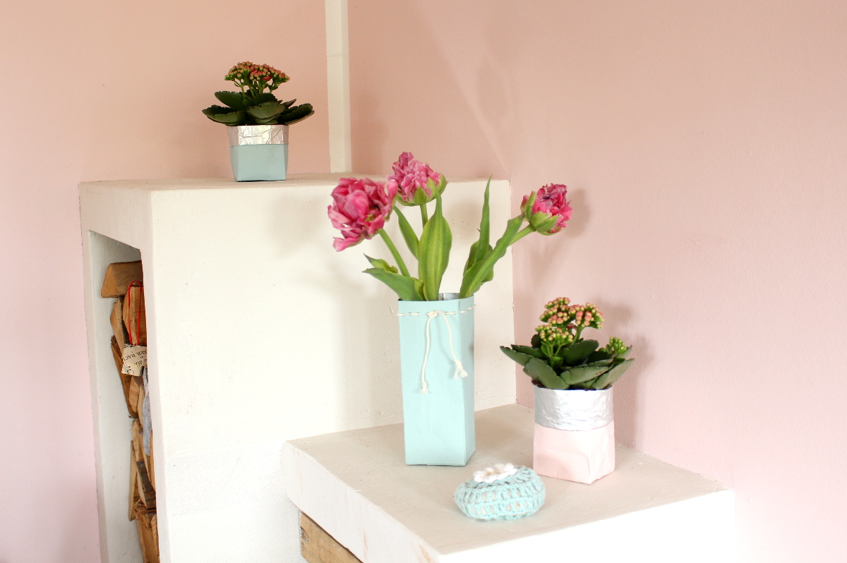 In die Vase habe ich mit der Lochzange noch alle 2 cm Löcher gestanzt und eine dünnere Baumwollkordel durchgezogen. Bei den Übertöpfchen habe ich das silberne Innere vorsichtig zweimal nach außen gekrempelt. Fertig ist ein kleines Upcycling, was sich auch befüllt sehr gut als kleines Mitbringsel eignet.