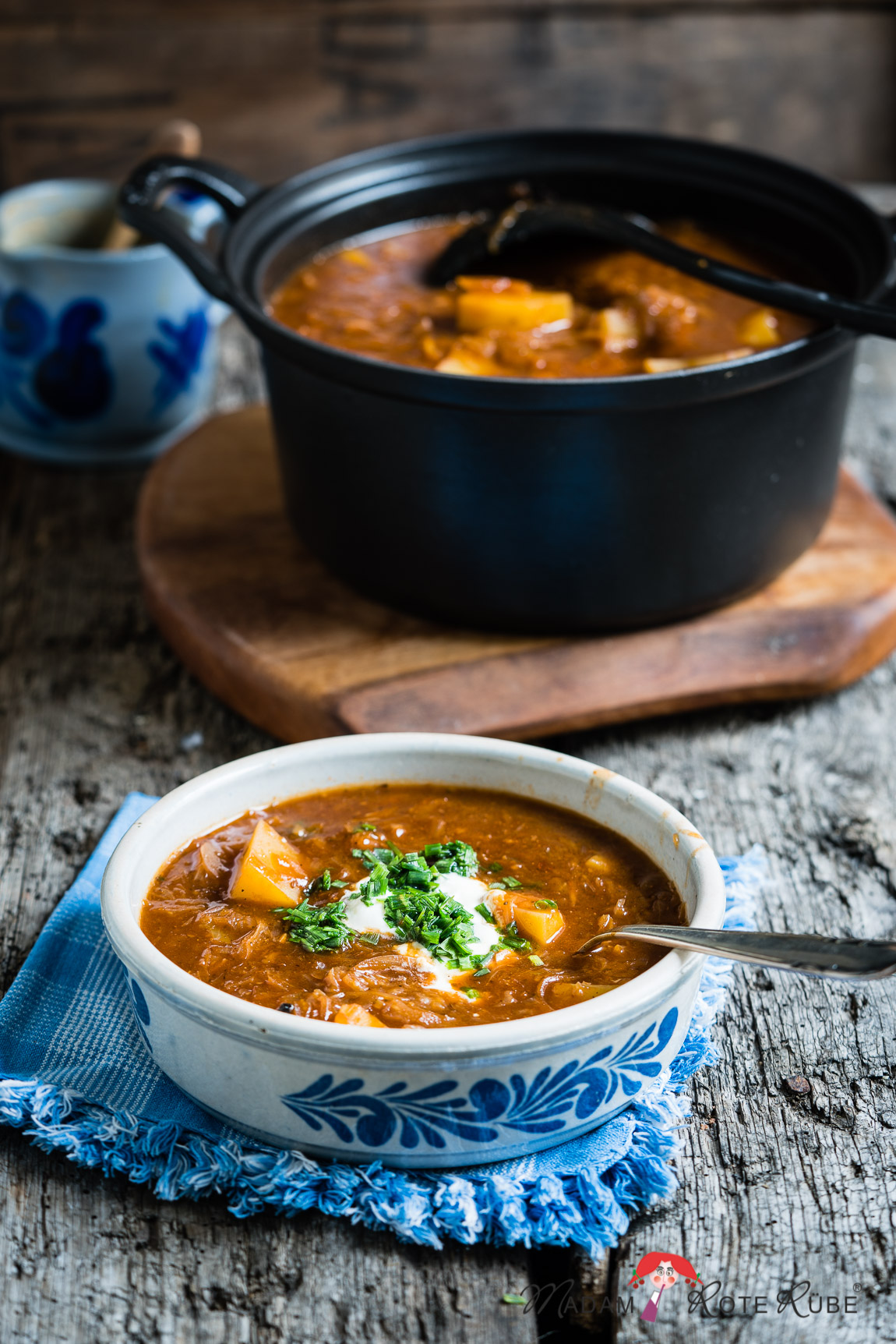 Zuerst die Zwiebeln und den Knoblauch geschält und kleingeschnitten im Olivenöl anbraten. Dabei ist es wichtig sich Zeit zu lassen und für die Entwicklung von leckeren Röstaromen die beiden Zutaten schön lange und langsam brutzeln. Dann die Paprikagewürze und das Tomatenmark kurz mit in den Topf geben und unter Rühren braten. Mit Gemüsebrühe ablöschen. Geschälte Kartoffeln, in Würfel geschnitten, Möhren und die restlichen Gewürze für ca. 15 Minuten mitkochen. Zum Schluss das kleingeschnittene Sauerkraut in den Eintopf geben und noch einmal für eine Viertelstunde kochen lassen. Ist alles gar, mit Apfelessig, Senf, Agavendicksaft, Salz, Pfeffer und Muskatnuss kräftig abschmecken. Gern auch noch ein bisschen durchziehen lassen. Dann schmeckt der Eintopf besonders gut.