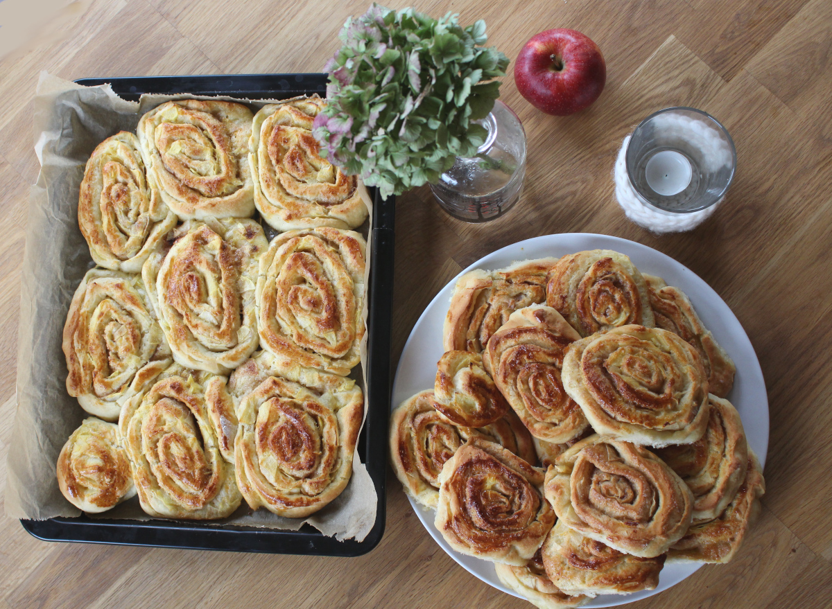 Den Teig zu einem Rechteck ausrollen, die Äpfel schälen und in kleiner Stücke schneiden, die Butter cremig / weich rühren. Apfelstücke, Butter, Zucker-Zimt auf dem Teig verteilen. Dann den Teig von einer Seite her aufrollen, in ca. 2 cm dicke Scheiben schneiden und auf 2 Backbleche mit Backpapier legen.