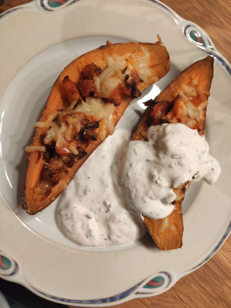 Die Füllung in die ausgehöhlten Süßkartoffeln geben und den veganen Käse oben drüber geben. Jetzt ca. 15 bis 20 Minuten bei 200 Grad gratinieren. Für den Joghurt braucht man nur die Zutaten zusammenrühren, Knoblauchzehen natürlich durch die Presse und fertig ist ein leckeres halb veganes, vegetarisches Essen.