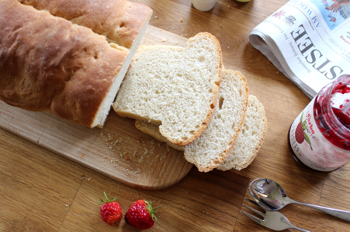 am Mittwoch habe ich das Toastbrot gebacken und es schmeckt echt klasse. Es ist richtig schön „luftig“ geworden und ist nach dem toasten wunderbar knusprig. Ich habe allerdings komplett 1050er Mehl genommen.