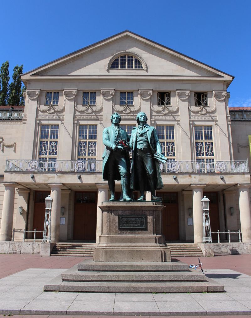 In der Kategorie „Thüringen entdecken“ darf die Kulturstadt Weimar nicht ausgelassen werden. Sie ist ein wirkliches Kleinod. Geschichte quillt aus jeder Pflasterritze und bringt einem die Klassiker Goethe und Schiller näher als jeder Deutschlehrer es vermag. Startpunkt unserer Entdeckungsreise war das Zentrum der idyllischen Stadt mit dem berühmten Goethe-Schiller-Denkmal.