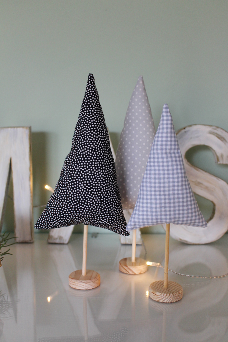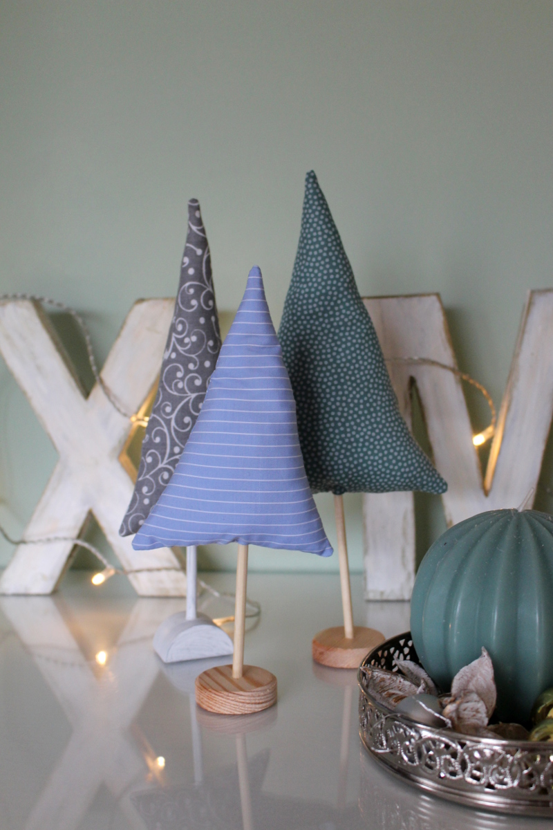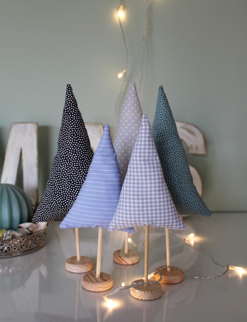 Jetzt steckst du die „Baumstämme“ in die Stoffdreiecke und füllst sie mit Watte. Du kannst auch Wollreste oder Stoffreste nehmen. Hauptsache die Bäumchen bekommen ein wenig Füllung. Der letzte Schritt ist die Wendeöffnung unten mit der Hand zu schließen. Fertig sind deine Bäumchen.