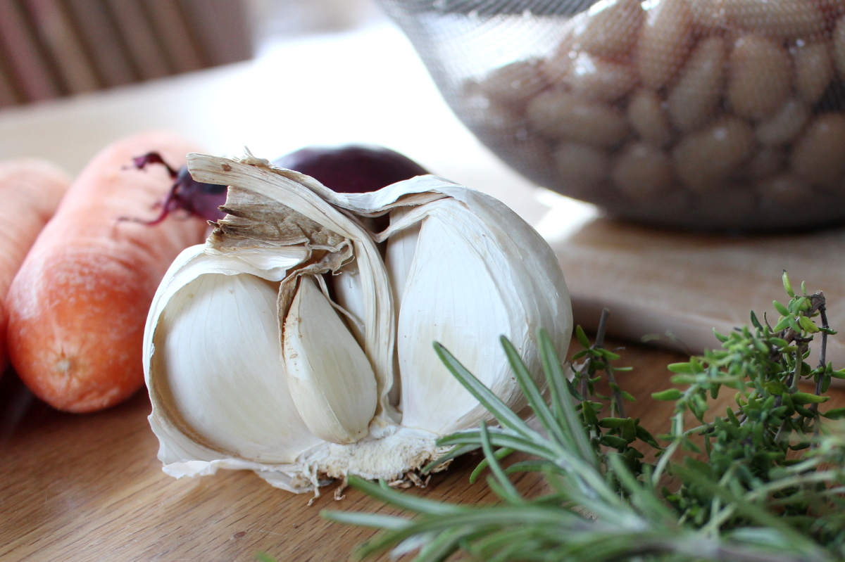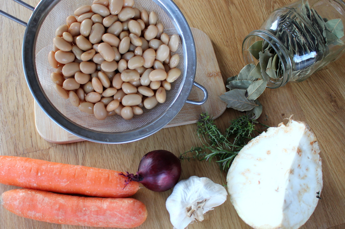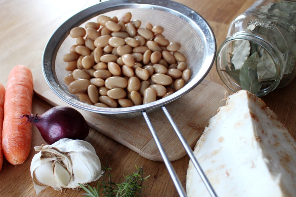 - Die Bohnen waschen und in einem Sieb abtropfen lassen. Zwiebeln, Knoblauch, Möhren und den Knollensellerie schälen und in kleine Würfel schneiden.