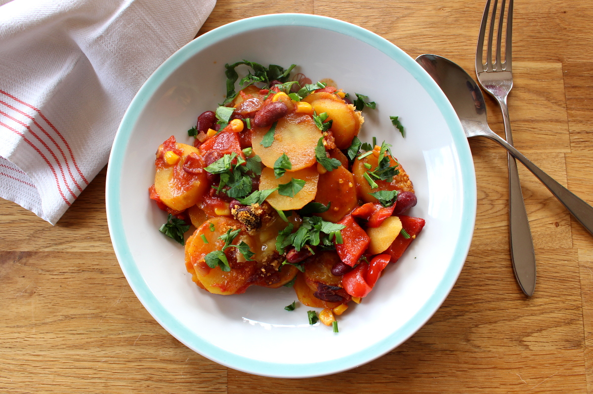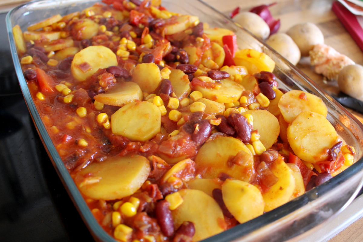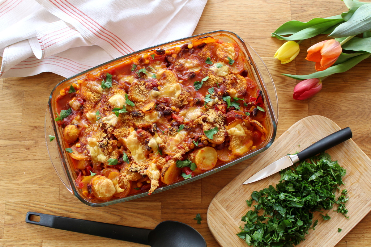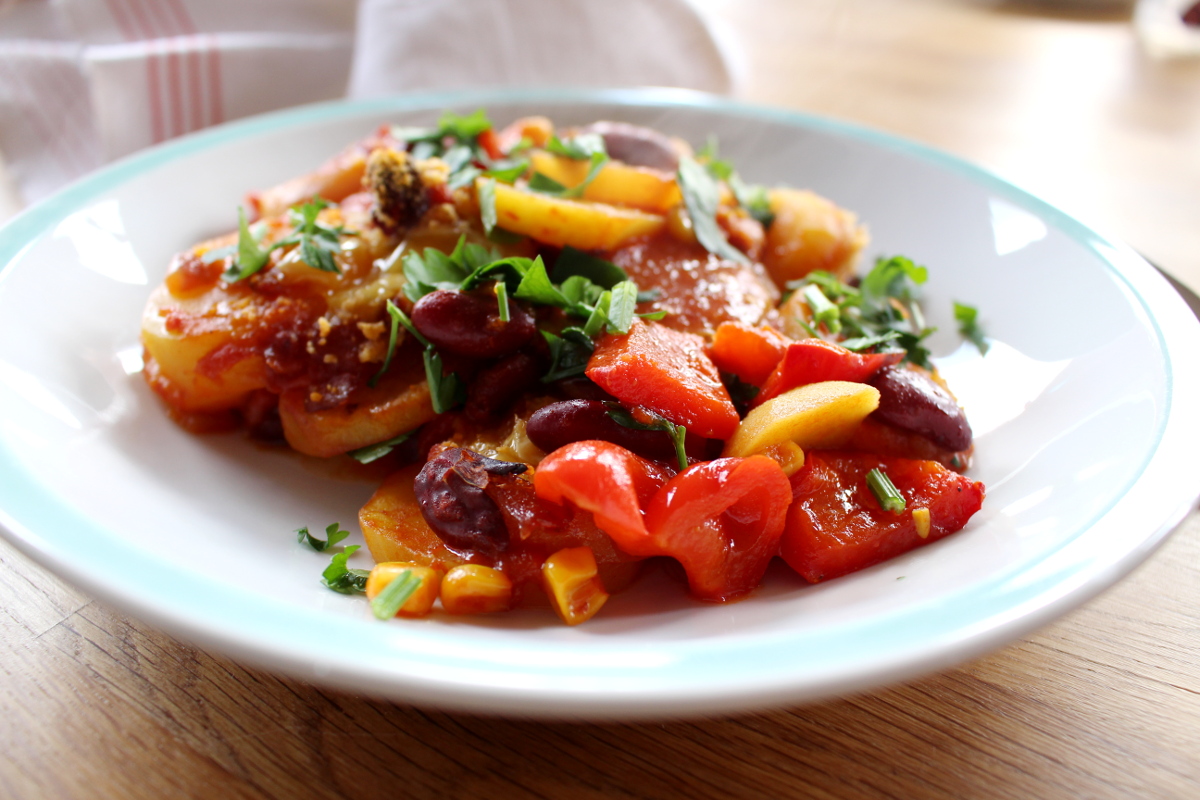 Hola Chicas, heute wird es mexikanisch in der Küche. Wenn du Lust auf einen deftigen Kartoffelauflauf mit Kidneybohnen und Mais sowie einem knusprigen Topping aus veganem Käse, dann bist du hier genau richtig. Als das Tochterkind für ein paar Tage bei uns verbrachte, um sich von ihrem anstrengenden Studium zu erholen, kochte sie gemeinsam mit ihrem Freund dieses leckere Essen für uns. Also ich muss ja sagen, daran könnte ich mich gewöhnn, dass ab und zu jemand für mich kocht. Ansonsten wetze ich als Herrscherin über die Küche die Messer ganz allein. Grundsätzlich mache ich das auch sehr gern, aber so ab und zu würde mir eine Küchenauszeit schon gut gefallen. Wie dem auch sei, habe ich letztes Wochenende den mexikanischen Kartoffelauflauf nachgekocht, meine Variation aufgeschrieben und fotografiert. Somit kommt ihr auch in den Genuss dieses leckeren Rezeptes, dass bei feucht-kaltem Aprilwetter den Magen wärmt und mit einer leicht scharfen Note pikant den Gaumen kitzelt. So Chicas und jetzt ran an die Töpfe und Pfannen.¡Arriba!