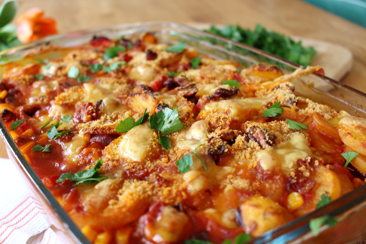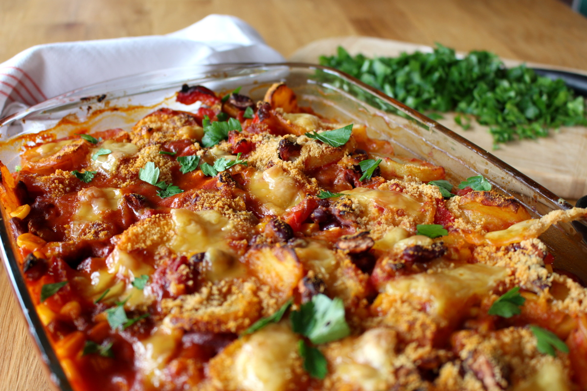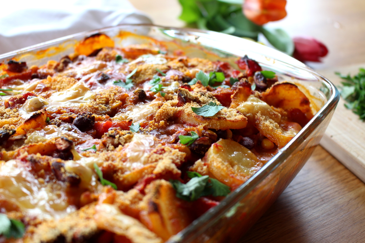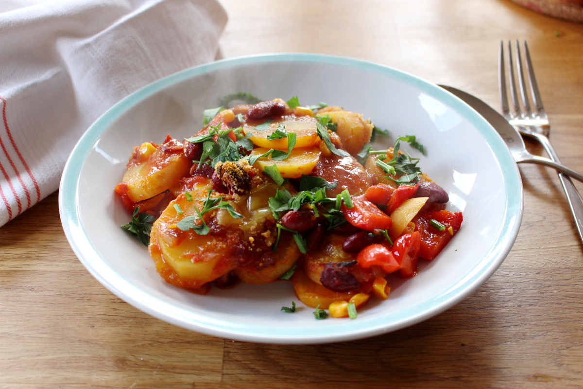 Hola Chicas, heute wird es mexikanisch in der Küche. Wenn du Lust auf einen deftigen Kartoffelauflauf mit Kidneybohnen und Mais sowie einem knusprigen Topping aus veganem Käse, dann bist du hier genau richtig. Als das Tochterkind für ein paar Tage bei uns verbrachte, um sich von ihrem anstrengenden Studium zu erholen, kochte sie gemeinsam mit ihrem Freund dieses leckere Essen für uns. Also ich muss ja sagen, daran könnte ich mich gewöhnn, dass ab und zu jemand für mich kocht. Ansonsten wetze ich als Herrscherin über die Küche die Messer ganz allein. Grundsätzlich mache ich das auch sehr gern, aber so ab und zu würde mir eine Küchenauszeit schon gut gefallen. Wie dem auch sei, habe ich letztes Wochenende den mexikanischen Kartoffelauflauf nachgekocht, meine Variation aufgeschrieben und fotografiert. Somit kommt ihr auch in den Genuss dieses leckeren Rezeptes, dass bei feucht-kaltem Aprilwetter den Magen wärmt und mit einer leicht scharfen Note pikant den Gaumen kitzelt. So Chicas und jetzt ran an die Töpfe und Pfannen.¡Arriba!